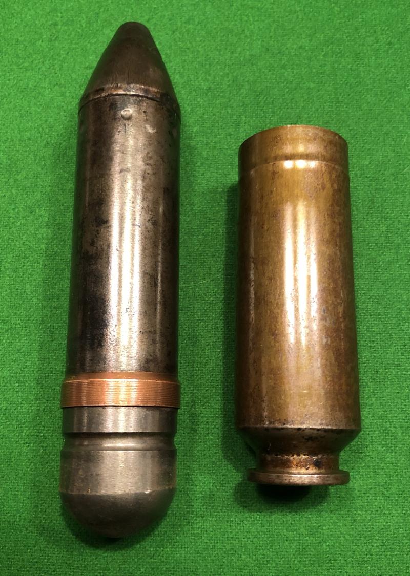 WW2 German 30 mm MK108 M Practice Aircraft Cannon Round. Steel practice Type H Minengeschoss (High Capacity) practice projectile with an unfired copper driving band, the nose fitted with a steel plug resembling a AZ1504 fuse and crimped by six round crimps. Contained in a lacquered steel case, dated 44 with manufacturer's details and an electric primer.