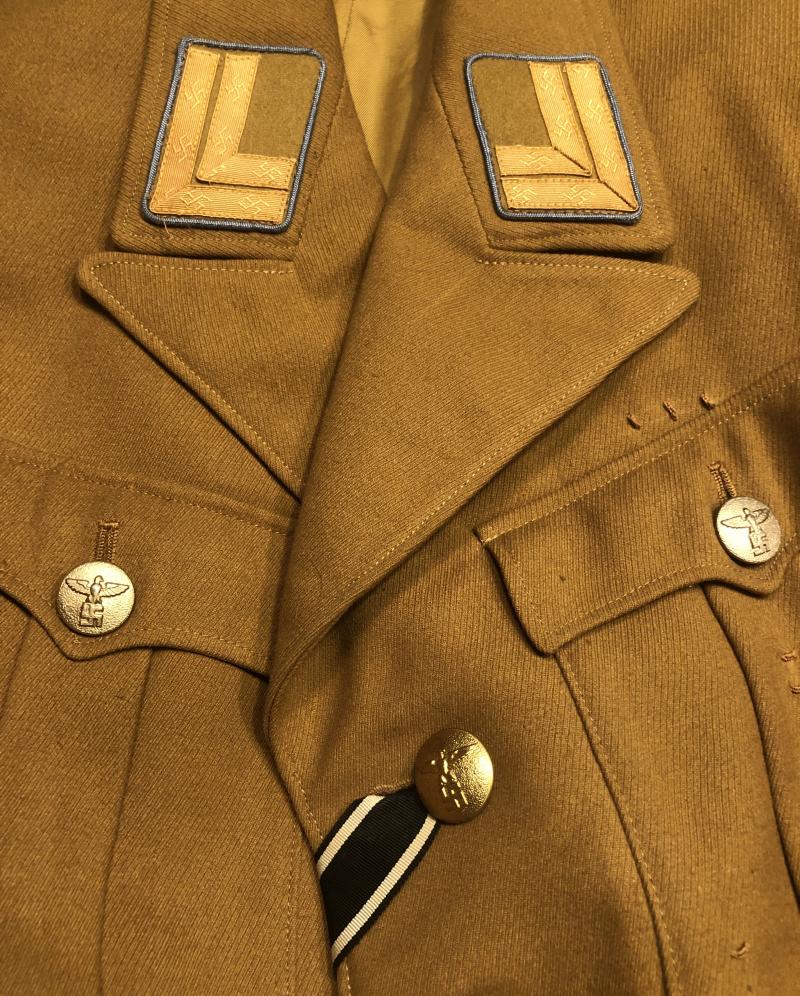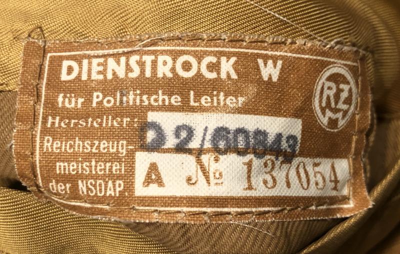 Brown twill wool tunic with gilt political buttons all having matching RZM details. Machine applied Zellenleiter collar boards with blue piping and bright tress. Woollen party armband to left arm ( with some well repaired moth damage ), WW1 EKII ribbon to top button hole and tailor applied award loops. Fully lined with a ' 50 ' stamped to rear and RZM label sewn to interior of left chest pocket.