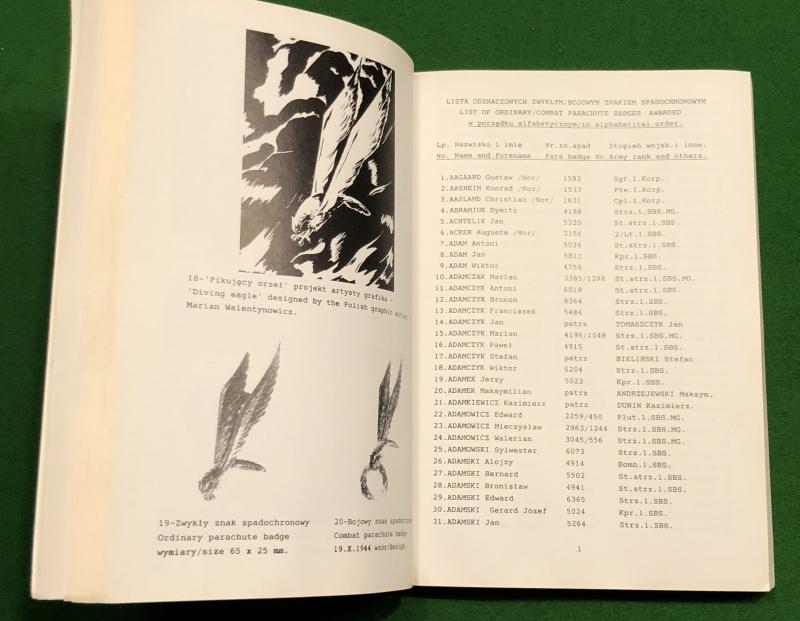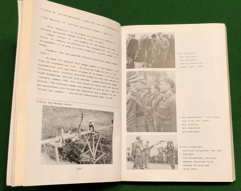 1993 History of the Polish Parachute badge published by the Sikorski Institute, Pb edition. Dual Polish/English text with analysis and history of the badge but more importantly a listing of all recipients of both the badge and the wreaths. This allows identification of all known recipients by cross referencing of the issue numbers present on all original wings. Good, used condition, important reference.