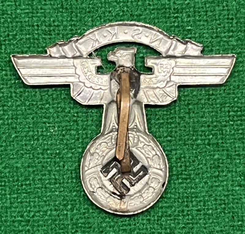 Die stamped white metal N.S.K.K. cap emblem. RZM and ' Ges.Gesch.' marked to reverse, both pins intact.