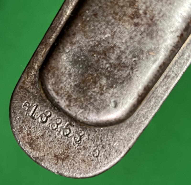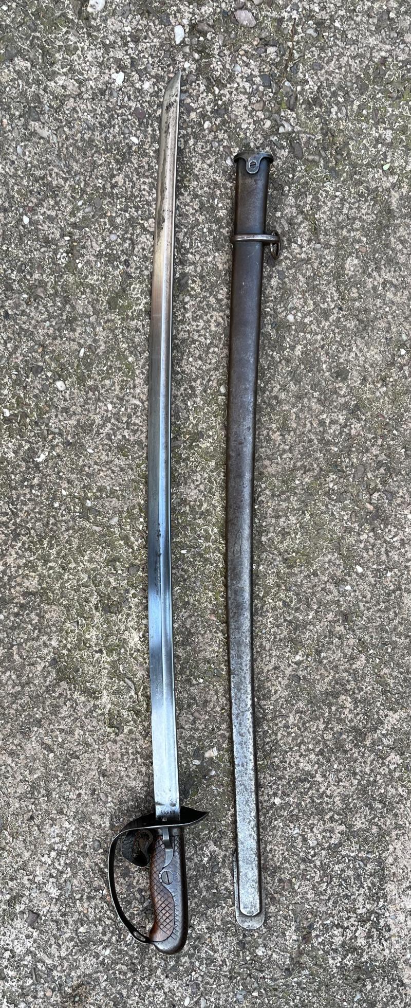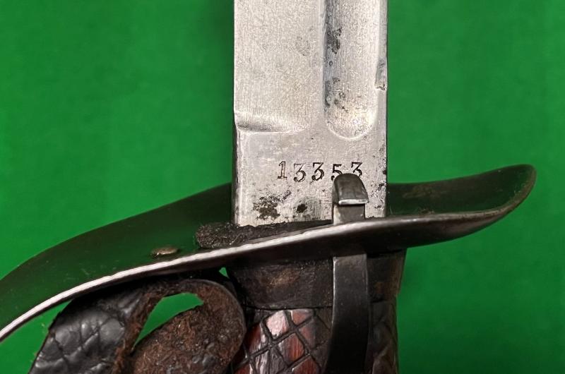 The Japanese Type 32 Saber was a government-issued cavalry sword. It was first issued in 1889 and would be manufactured until the end of WWII. The blade is katana-like in styling, though it has the proportions of a saber and was built in two lengths. This example, a second pattern ‘Otsu,’ was issued to army NCOs and and has a blade length of around 770mm with the leather finger loop indicating earlier manufacture. Numbered to the ricasso with a matching number to the scabbard drag. In good, used condition with a matching toned appearance overall with some light staining, but no pitting to the blade. Good example.