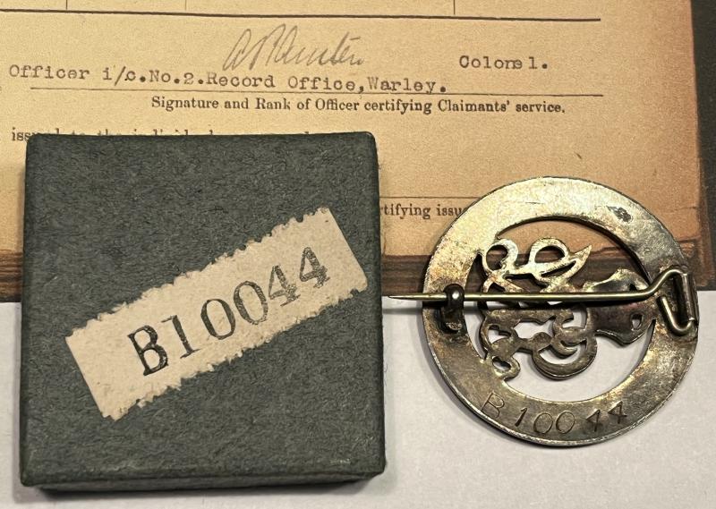 Good example of a WW1 British Silver War Badge numbered B273987. In excellent condition coming with it's original issue box with matching number indicating issue to a Edgar George Boyden 4th Btn. Essex Regt. Good, clean condition, lightly toned overall.