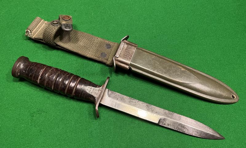 A good example of the US M3 fighting knife in an M8 scabbard. Manufactured by Utica with markings to guard and ordnance marked to pommel and undamaged leather handle, lightly sharpened blade with full profile.