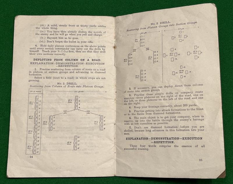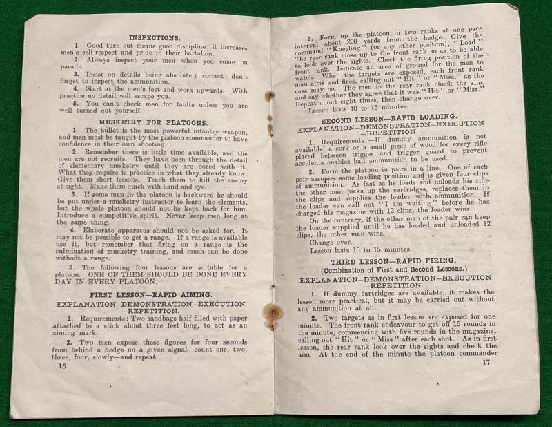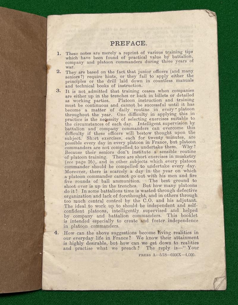 1918 ' Hints on Training ' - Issued by XVIII Corps. Printed in France with 25pgs summing up trying hints derived from experience gleaned during the previous three years of combat. Some illustrations and in good used condition with some minor creasing and marking.