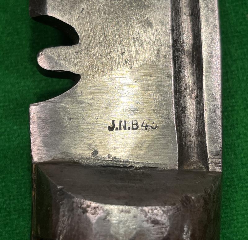An excellent example of a WW2 MkII British Pattern military kukri. Dated and manufacturer marked to steel blade ' J.N.B.43 ' with steel bolsters and brass and steel rivets. Wood and leather sheath with brass tip and the addition of a steel representation of Sgt's stripes surmounting a brass crescent. Brass shield to throat with inspection stamps above. A name ' Gates ' inscribed to reverse. Excellent, clean condition with clear evidence of sharpening.