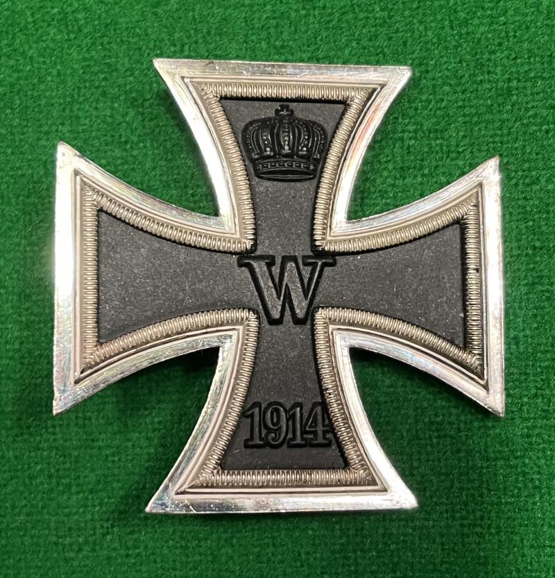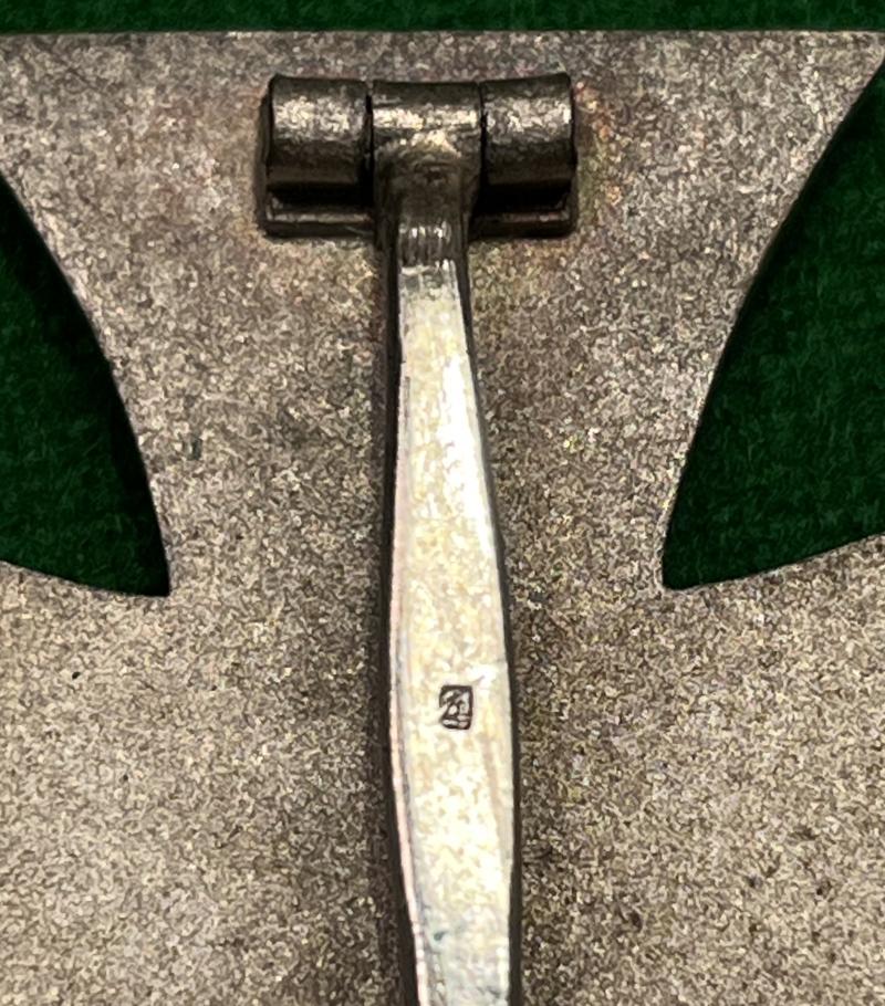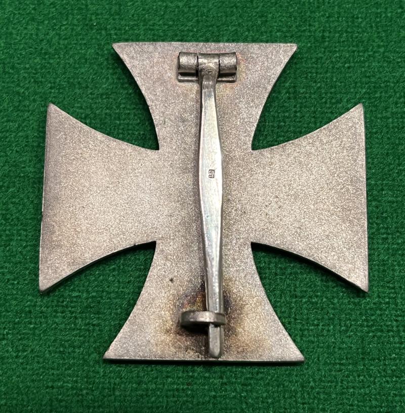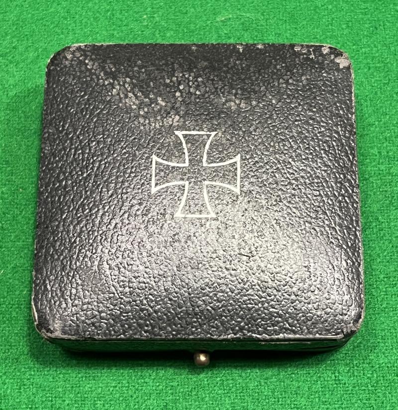 Excellent example of a cased Third Reich manufactured WWI EKI. Manufacturer marked ' 4 ' to coke bottle shaped pin indicating manufacture by Steinhauer & Luck Ludenscheid. Bright silver and frosted frame with mint, deeply blacked core. Three-piece construction with block hinge and flat wire catch. Toned to reverse where in contact with plush lining of standard Third Reich EKI case of issue. Impressed cross to lid with rubbing to highlights of the leather effect covering with undamaged steel hinge. Push-button opening.