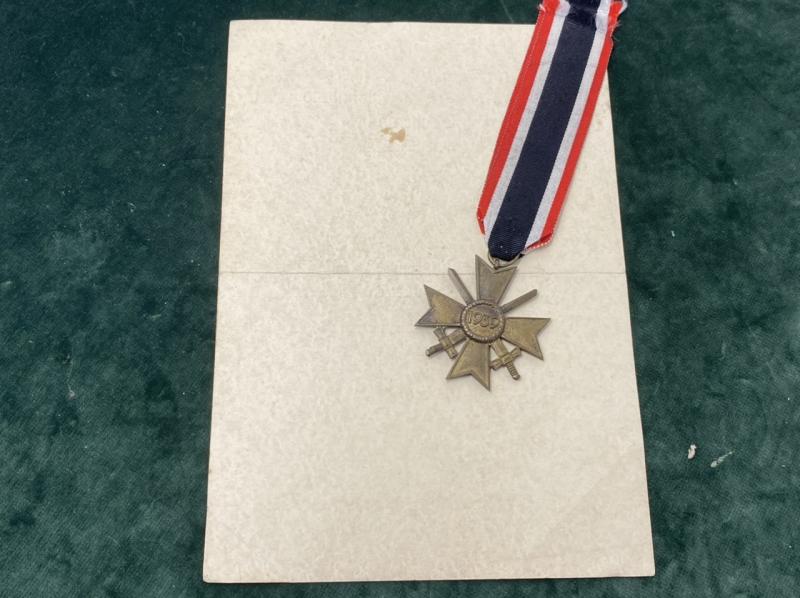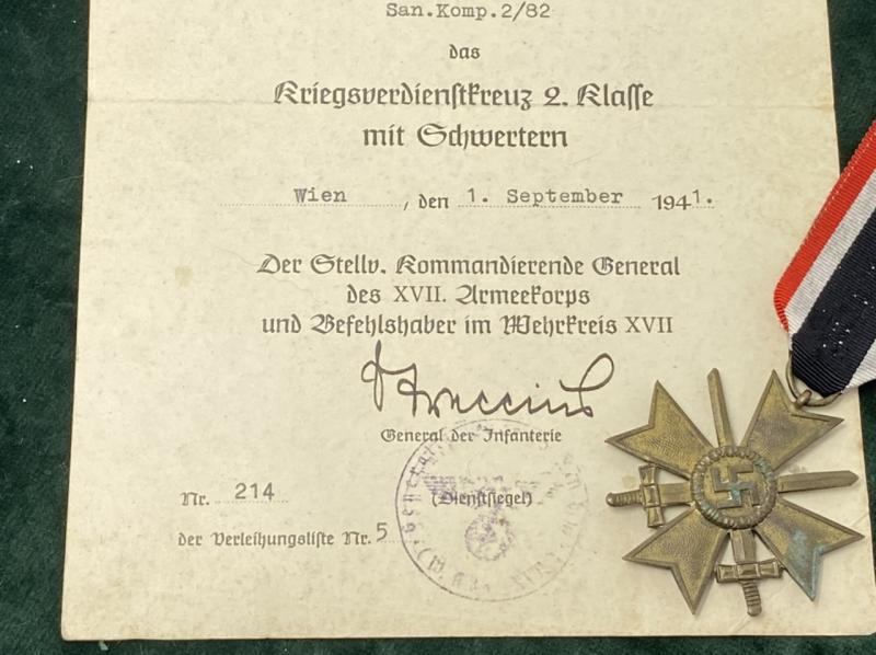 Am original War Merit Cross with swords and original full length ribbon, with the original award certificate/document. Awarded in September 1941 to a Rudolf Braunstingl who was an Obergefreiten in San.Komp 2/82. Document in perfect condition, no file holes. Medal has most of the gilt finish over the grey metal base. Nice set.