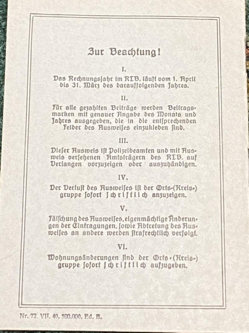 A membership/donations card for the RLB or Reichsluftschutzbund. Basically the AirRaid Protection organisation in Germany. Booklet is in mint condition with 6 pages. Donation stamps complete for 1941-42 and part of 1943-44. Interesting to note that whoever issued this book was quite optimistic as the donation pages are dated 1945-45, 1946-47, 1947-49 & 1948-49!!! Nice piece of history. Post free in. U.K.