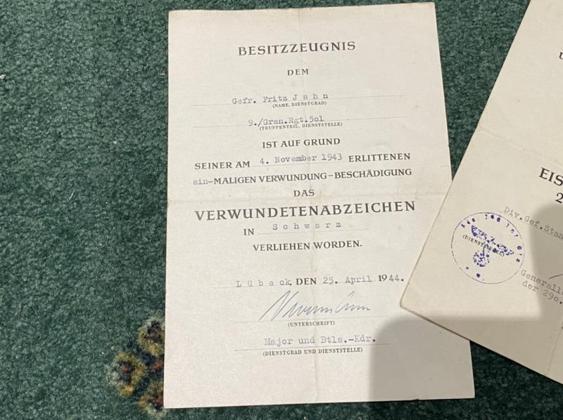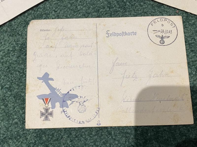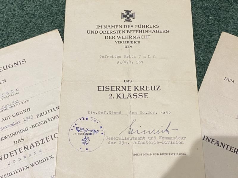 He was a Gefreiter Fritz Jahn in the 9. G.R/501. He was awarded the EKII in November 1943 the Silver Infantry Assault badge in April 1944 and was awarded a Black Wound Badge also in April 1944. All award documents are in excellent condition. Have been folded but no file holes. These have come from a direct family purchase in Germany. There is also a lovely Feldpostkart from November 1943. This has a diving Stuka dive bomber and an Iron Cross second class pictured, is completed in pencil on the front and reverse. A lovely grouping awarded to a serving soldier during the war.