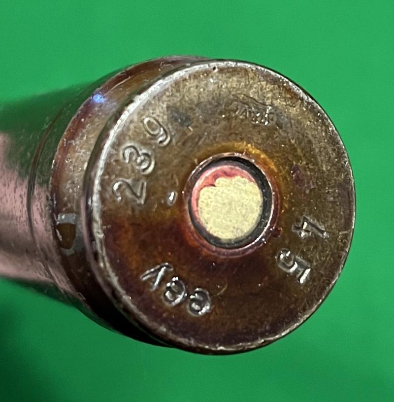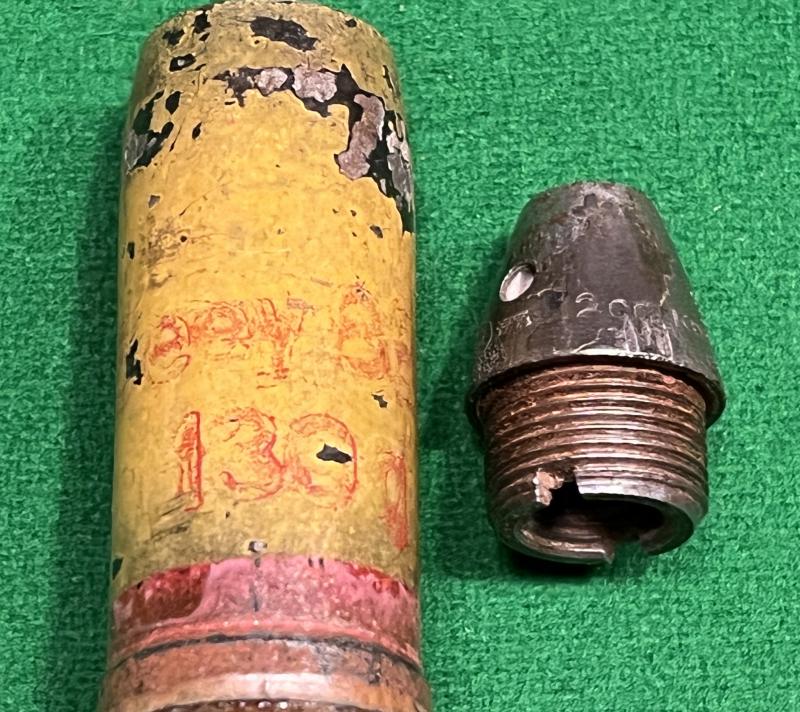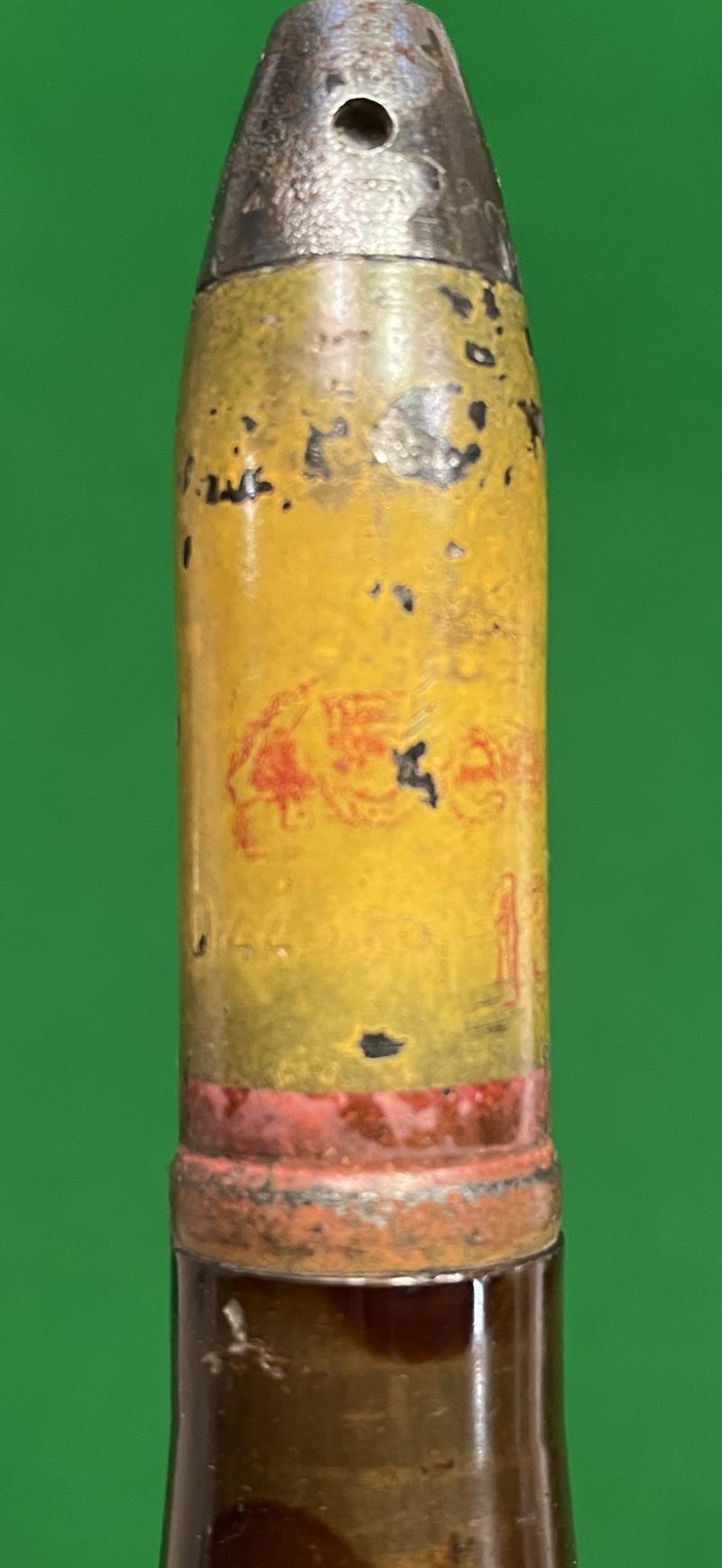 Complete 1945 dated Flak 38 20mm HE/T Round with 1945 dated lacquered steel case. 45 dated projectile with steel driving band and 44 dated Kpfz.Z48 fuze. Original paint with manufacturer's stencilling and inspection stamps. Good, original round with some corrosion to fuze