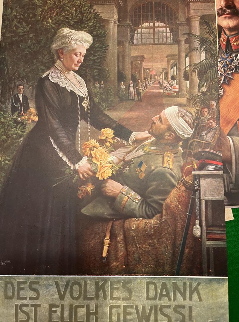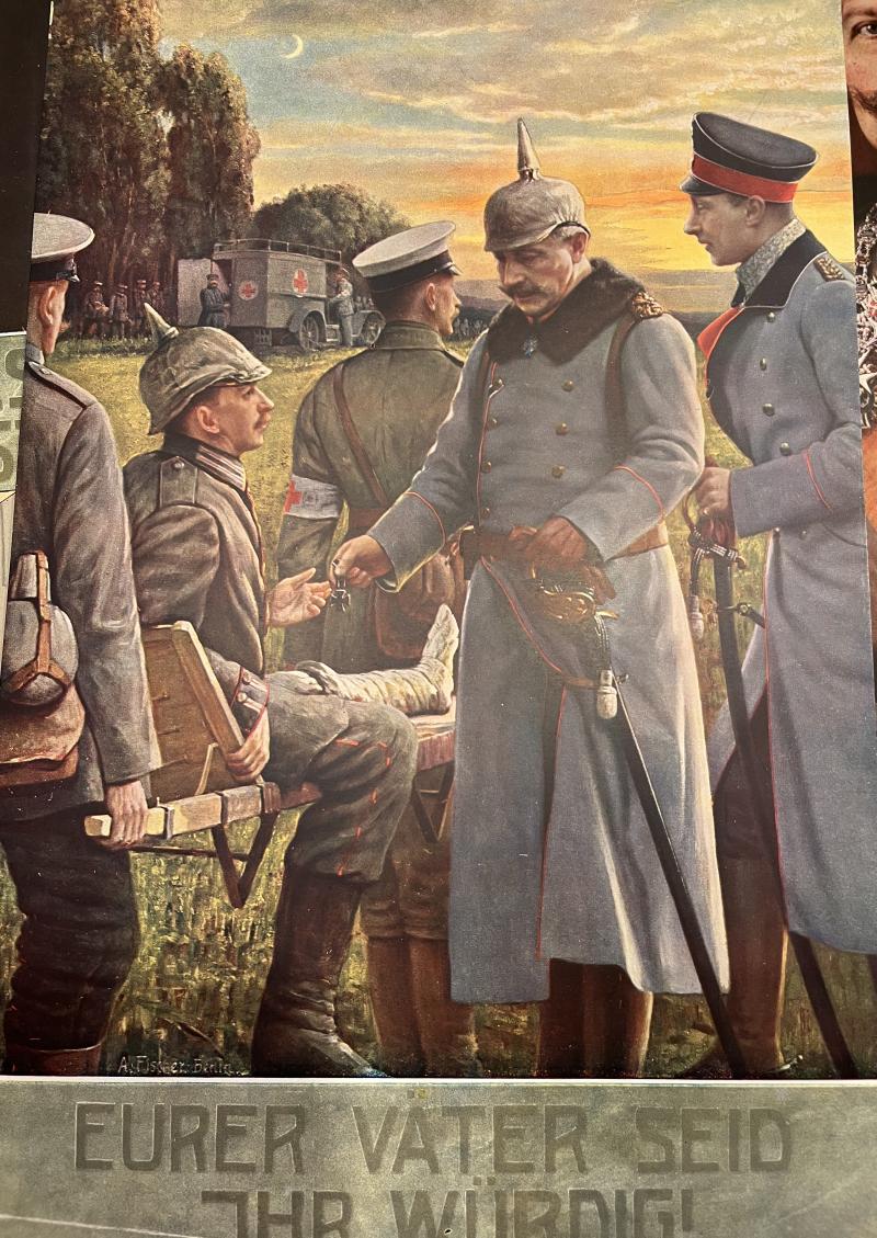 WW1 Imperial ' Invalidendank ' patriotic poster set. Complete with their original 1915 dated card envelope these 22cms x 34cms approx printed colour posters feature stirring scenes of wounded Imperial troops and the Kaiser. Also comes with the original explanatory flyer, it would appear that these posters could be purchased with funds going to support the wounded. Excellent, clean condition with some minor creasing etc.