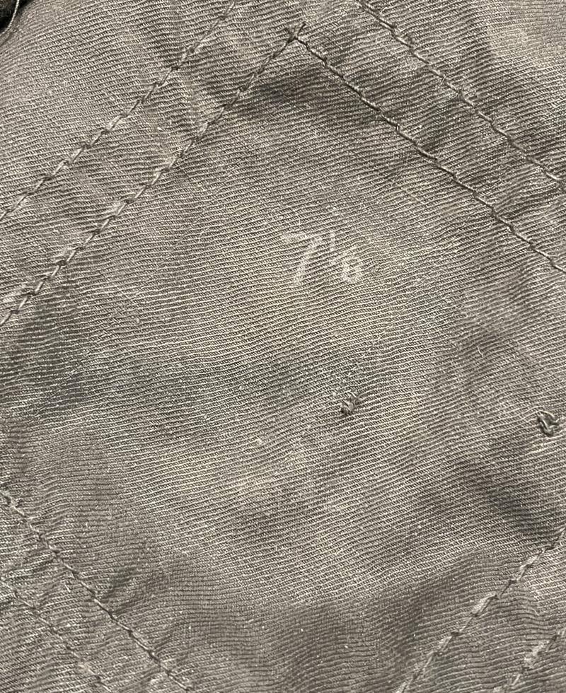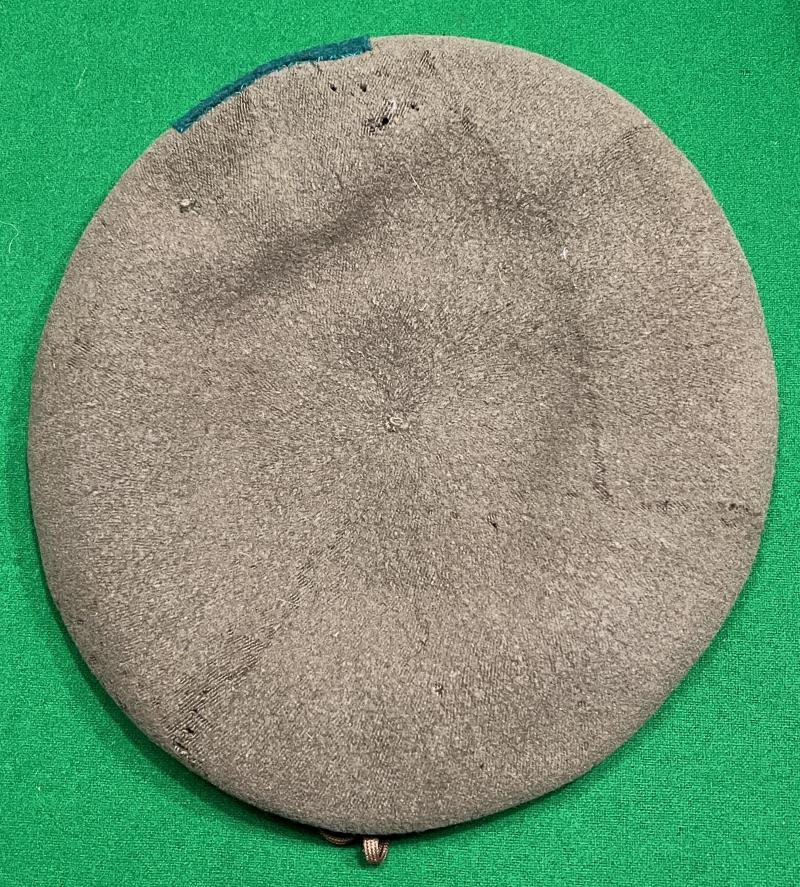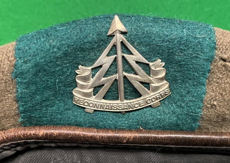 WW2 British Reconnaissance Corps beret. Size 7 1/8 and dated 1942 faintly visible although manufacturer's details now indistinct. Green, square backing with a white metal Reconnaissance Corps O/R's cap badge. Brown leather headband with leather reinforcement to ventilation grommets. Good, used condition but has suffered the depridations of moth with various track marks, grazes and minor holes.