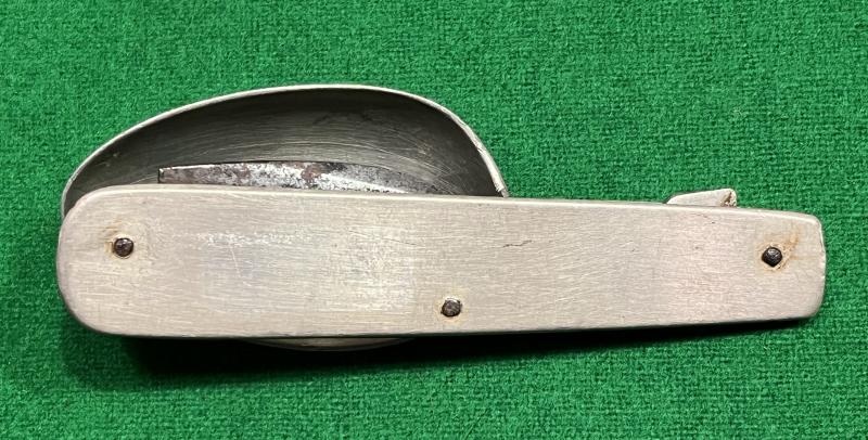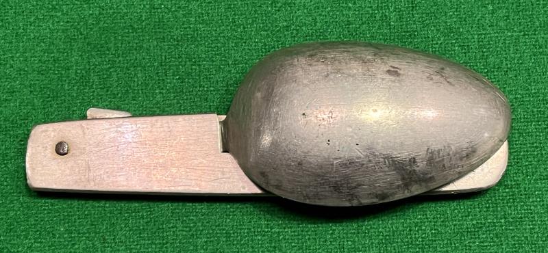 Nickel, folding, half canteen set popular with WW1 British officers. Nickel bolsters with fold out spoon to one end with a can opener to the other. Can opener marked ' oil the joints ' but is otherwise unmarked. Good, used condition, patinated overall.