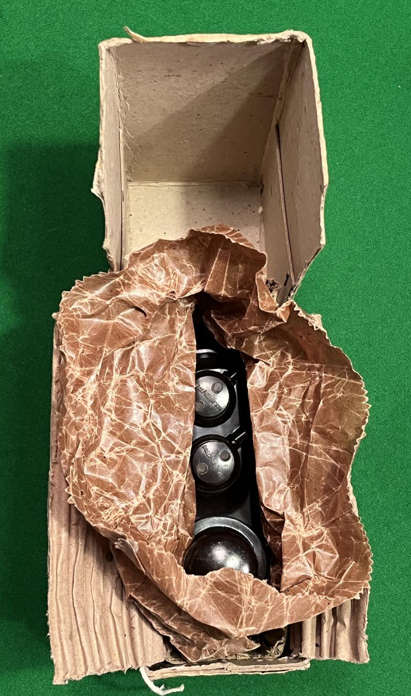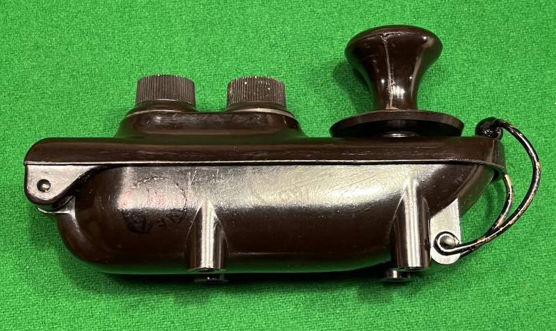 10F/7741. Brown bakelite Morse code key as used on all wartime bomber aircraft. Often referred to as the 'bath-tub' morse key, this example in original box and wrapping with stores labels and inspection marks etc. End of the box with pencilled ' 97 Sqn.'. Excellent, N.O.S. condition.