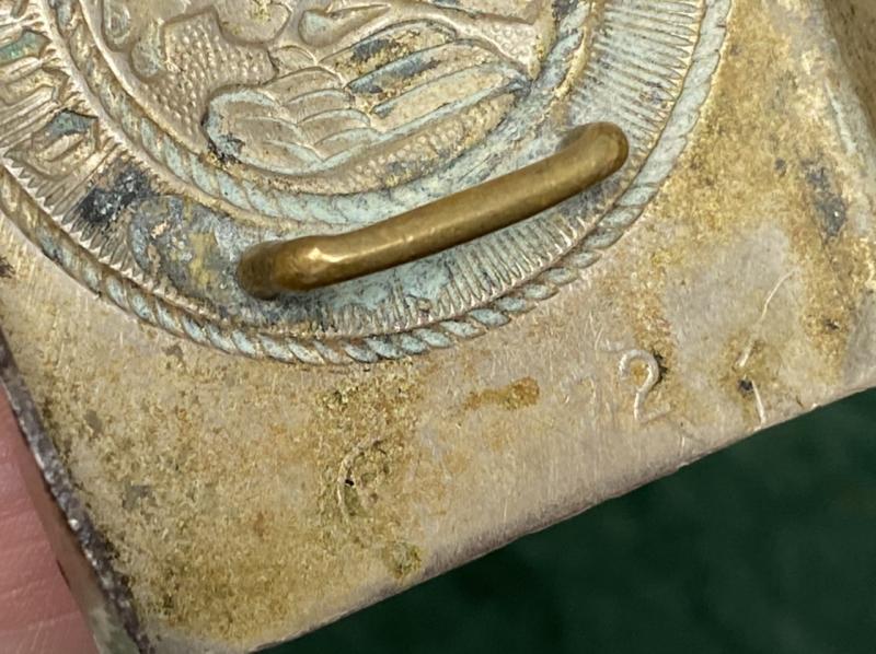 A great buckle here that’s really seen some proper use! Nickel plated over steel and complete with belt adjustment claw. The front eagle etc is quite worn on the surface, but still very clear. The reverse is RZM marked but as it’s been used so much, the metal tongue hook on the other part of the belt has rubbed away most of the RZM number! Good, honest wear. The RZM circle is there and the remains of the code which ends in 2. The other number could be 7? These were cast proud of the metal surface so have worn off with use of the hook. Great looking buckle.