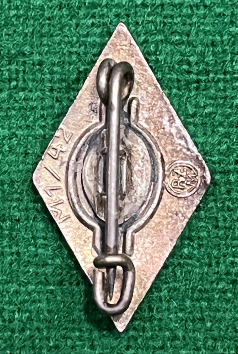 standard issue HJ membership pin, with white/red enamelled front. In excellent condition, nice pin-back reverse. Has RZM circle and maker code of M1/42, indicating manufacture by Kerbach & Israel of Dresden. Clean, lightly patinated condition with no loss of enamel but some stress marks to lower red quarter.