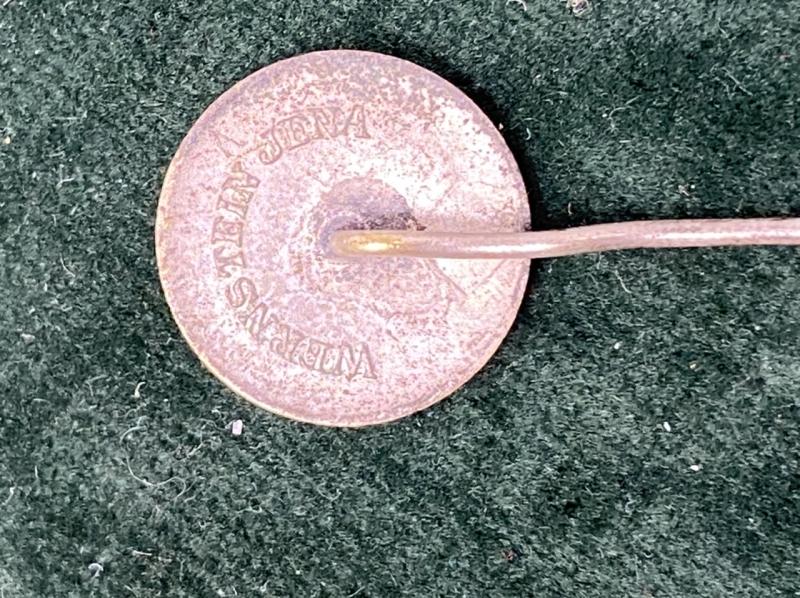 This is the stickpin version of the ‘Reichsjungendasportabzeichen’ or National Youth Sports badge awarded to school aged youths under 18. This version with the swastika was introduced in 1937. A great pin finished in silver. Twisted pin shaft and maker marked to the rear Wernstein Jena’