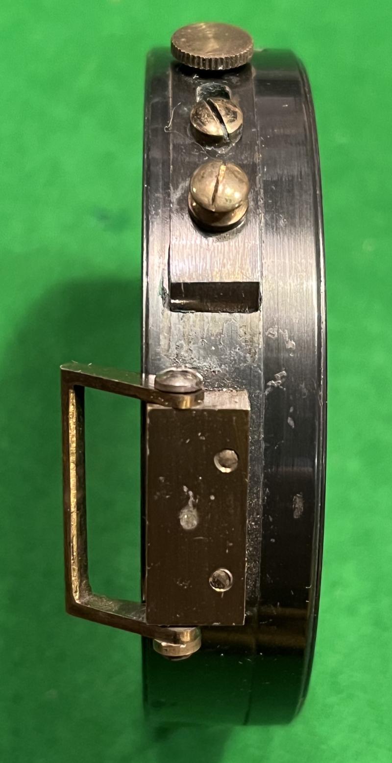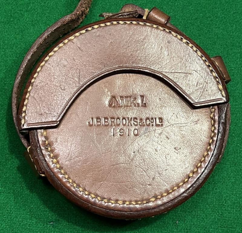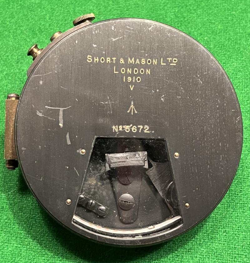 British Service Pattern Clinometer in leather pouch. Used to in surveying to measure angles of incline these instruments were essential part of an artillery or engineer officer's kit. High quality item made from lacquered steel and brass and maker marked ' Short & Mason, London 1910 ', appears to be in good working order. Leather pouch in good sound condition with manufacturer's mark ' J.B.Brooks & Co.Ltd. 1910 ' to one side.