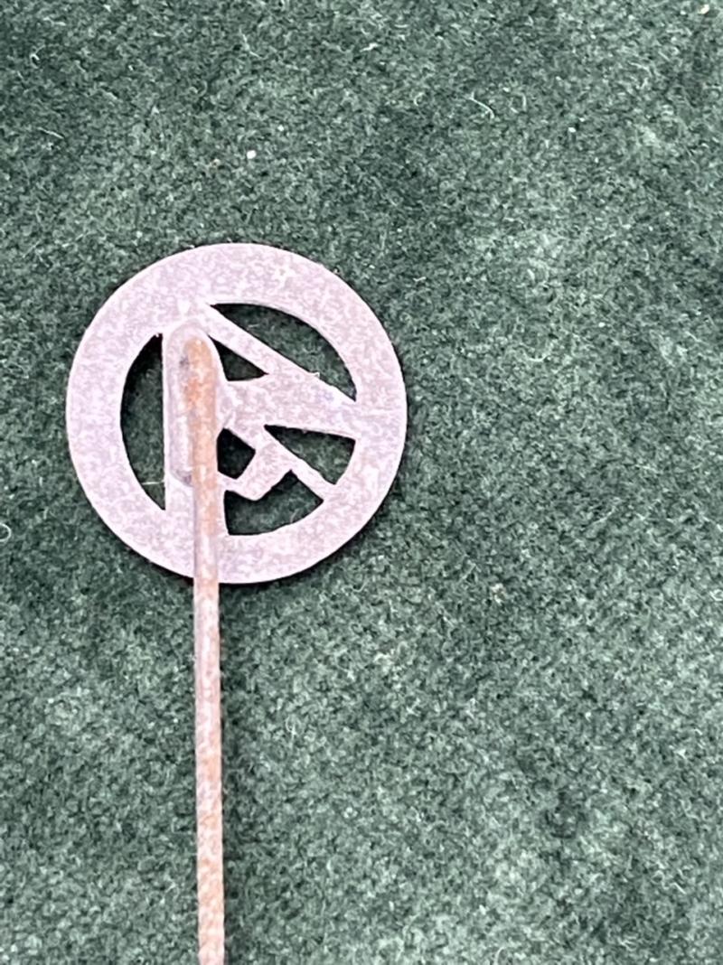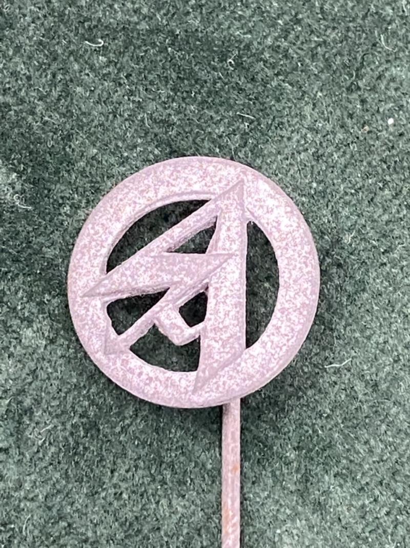 A nice silvered stickpin, a little oxidised on the surface. Shows the stylised SA circular symbol. On twisted steel shaft. Unusual pin.
