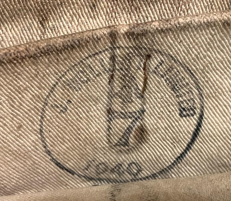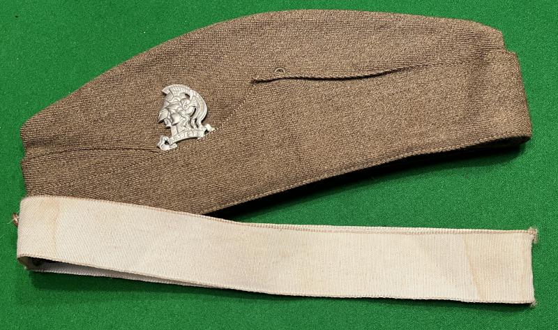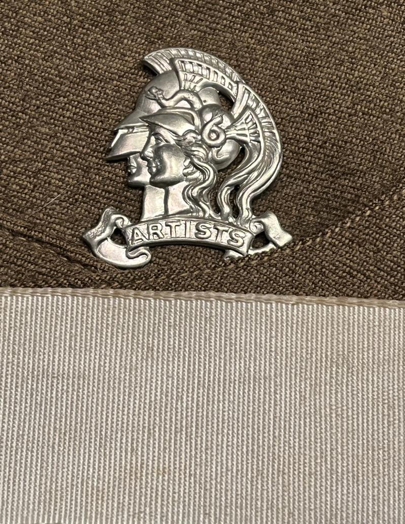 1940 dated FS Cap by J.Collett Ltd. for an officer cadet of the Artists Rifles. The aspirant nature of the wearer was signified by the 35mm wide tape worn as a cap band whilst at OCTU. This example, size 7, features a white metal Artists Rifles cap badge and is in excellent, used condition.