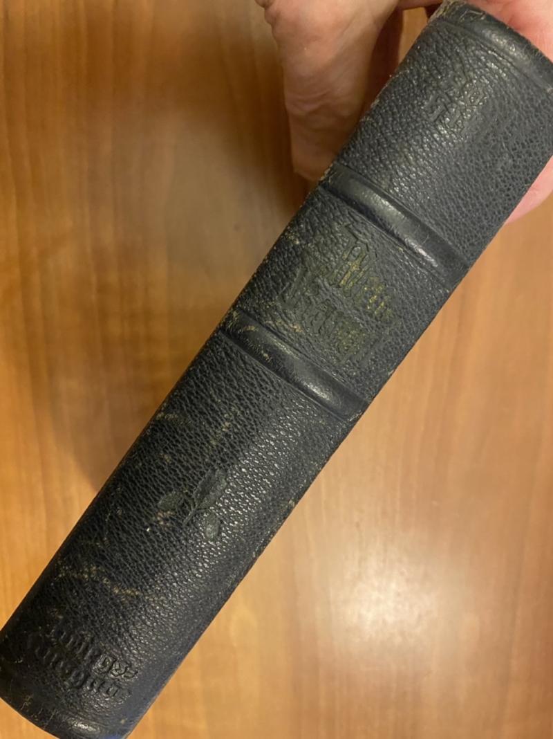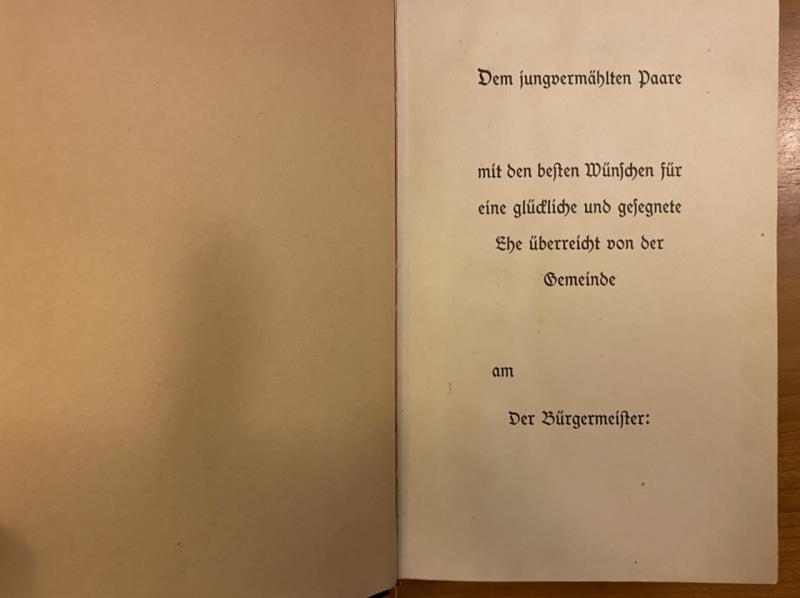 The infamous book written by Adolf Hitler whist in prison in the 1930’s. In excellent condition with blue leather spine. Lettering on the spine has faded but the impressions still strong. Never presented or filled in as gift from a local official. No wear or damage.