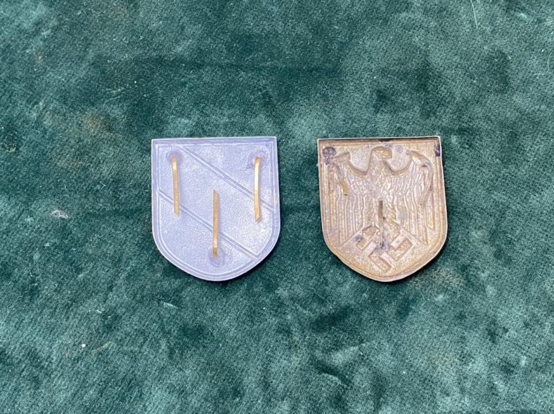 Quite often missing or broken from the sides of the helmet. Here is a pair of pressed metal insignia for the Tropical helmet. National colours ones side, National Wehrmacht eagle on the other.
