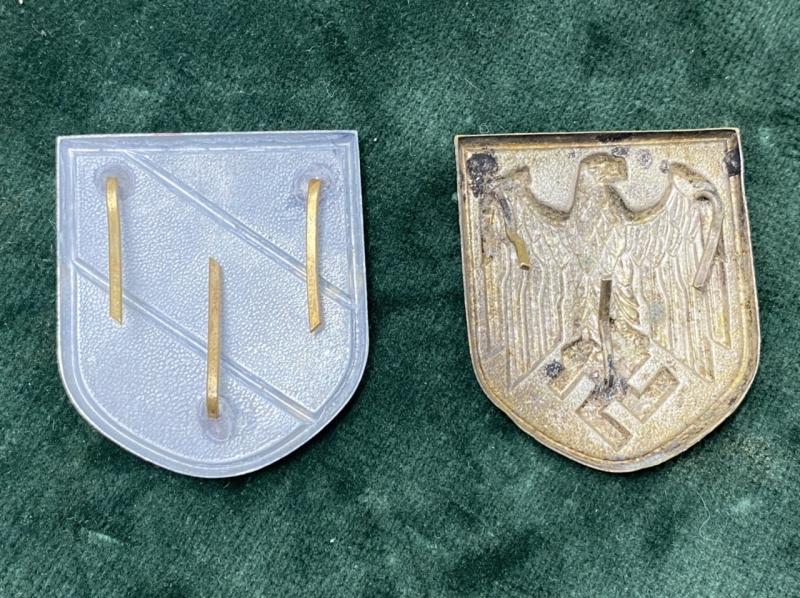 A SET OF METAL SHIELD INSIGNIA FOR AFRIKA KORPS TROPICAL HELMET.