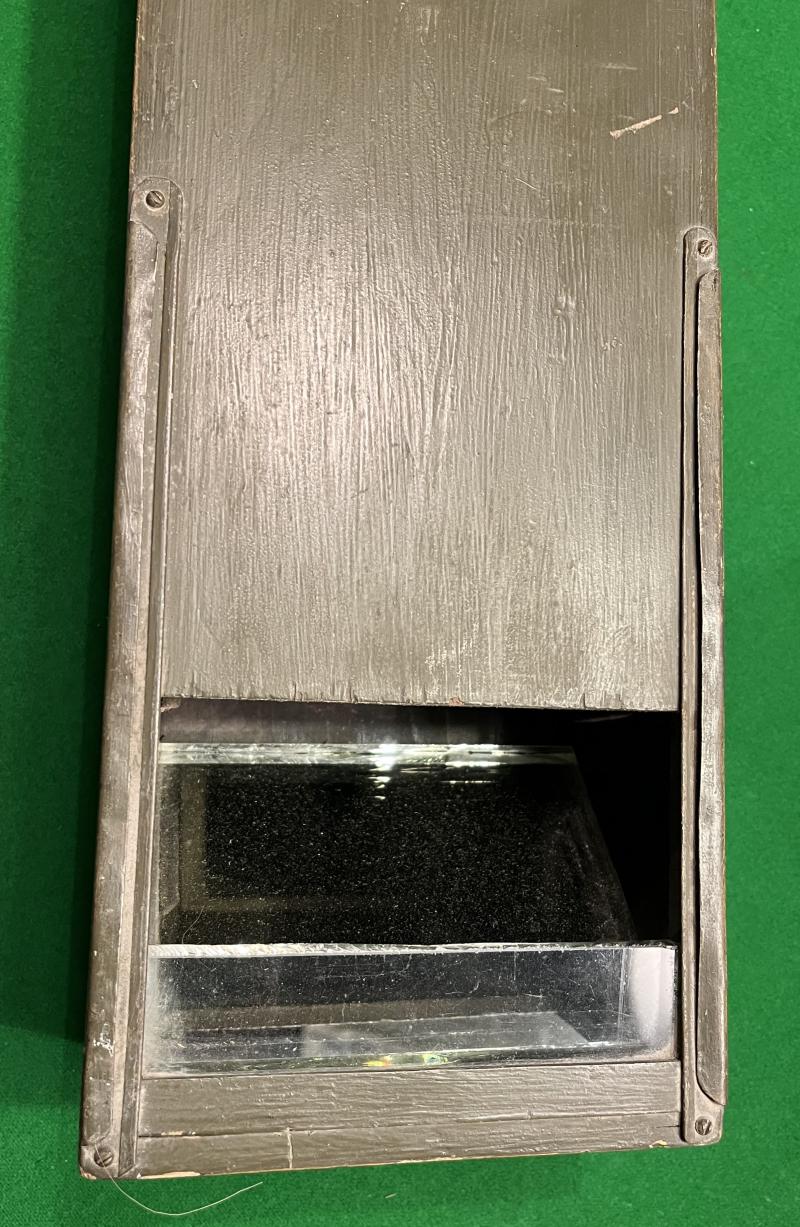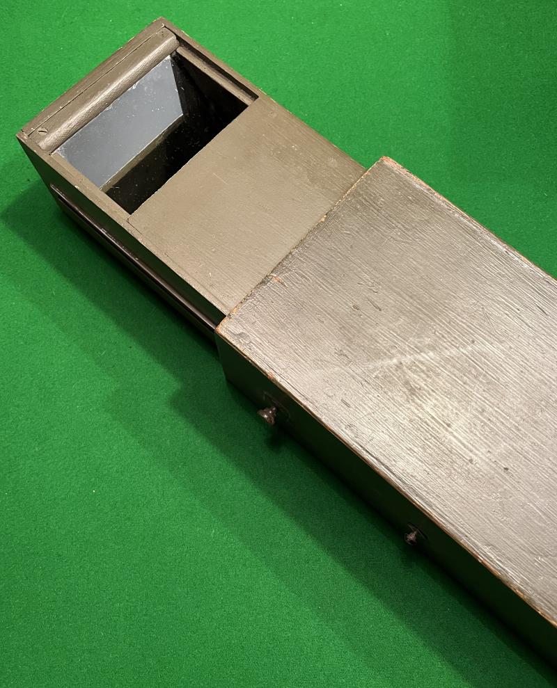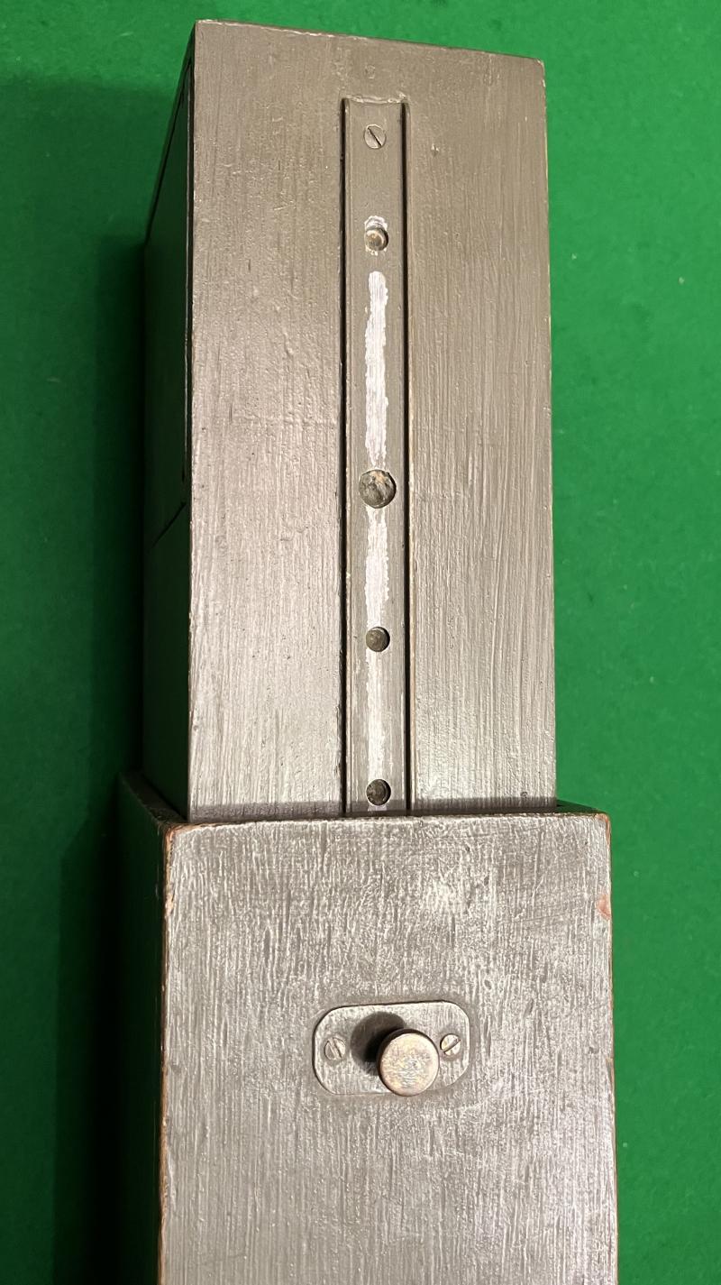 WW1 British wooden bodied, trench periscope with extending facility. Periscope has inner sleeve which enables it to be extended by increments retained by a brass, sprung loaded catch to the side. No markings evident and in good working condition. This example clearly has a sliding cover to the objective lens which is now missing as is a side mounted handle although does retain fixings. Unusual.