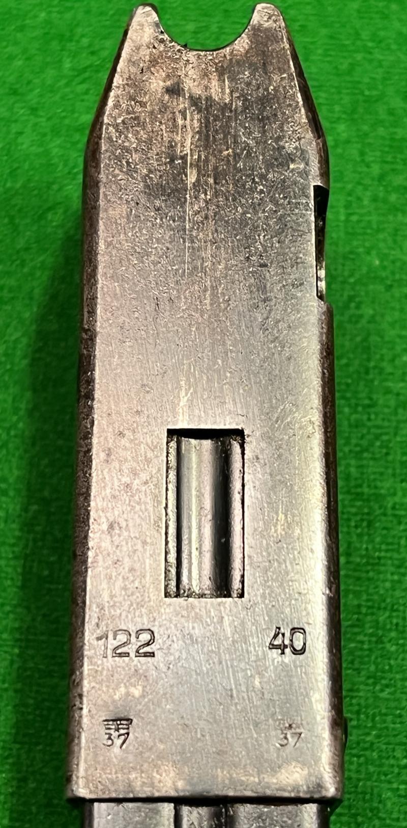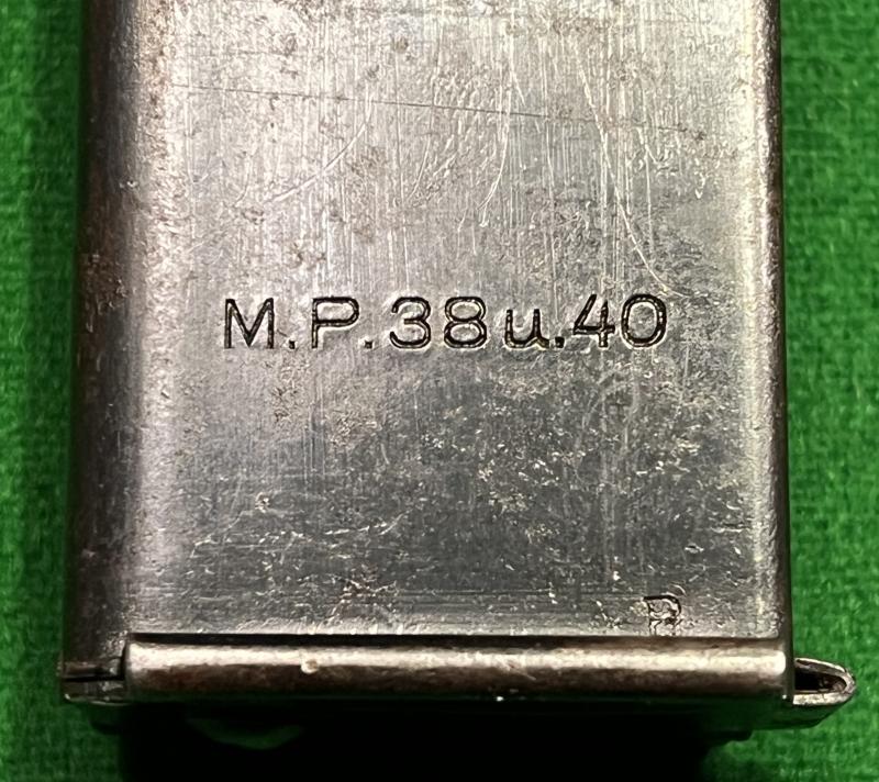 WW2 magazine for the German 9mm MP38 or MP40. In good used condition and marked ' M.P.38u40 ' as well as inspection marks and a 1940 construction date.