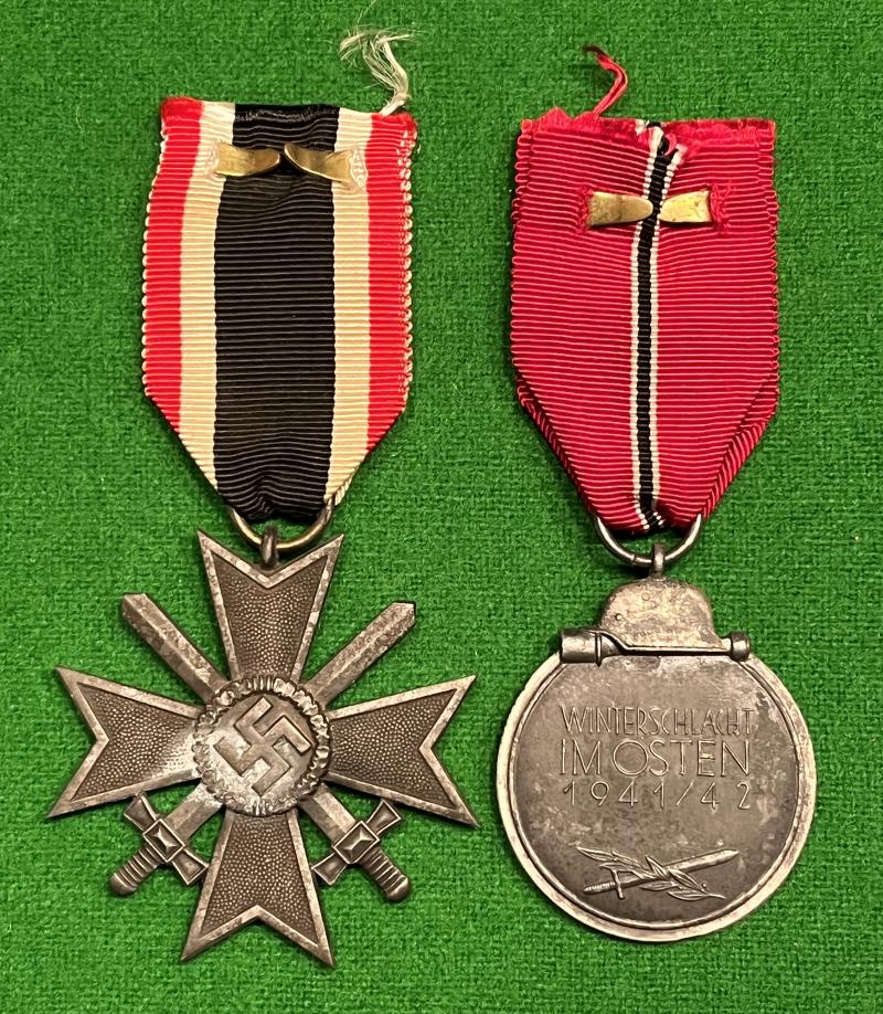 Unmarked, zinc KVKII with swords and Russian front medal with a ring mark ' 4 ' ( Steinhauer & Luck ) A pair of medals that have been removed form a medal bar which retain their brass staple fixings to the ribbons. Part of a small group of souvenirs which have not been kept in the most advantageous conditions and have been priced accordingly.