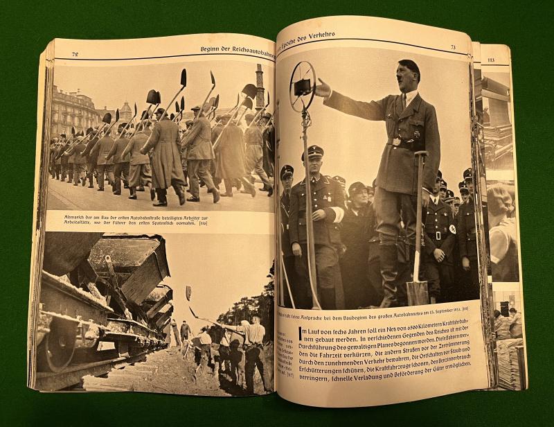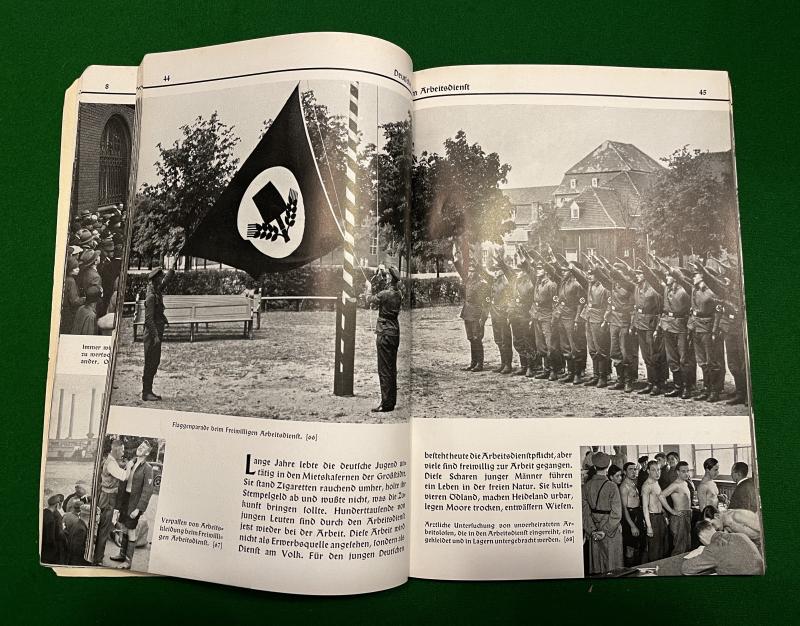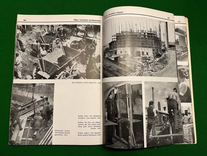1934 1st ed. ' Deutschland Arbeitet ' by Dr Eugen Diesel. 123pgs, soft cover propaganda survey of the importance of the German workforce in Hitler's Third Reich. Illustrated throughout with captioned b/w photographs showing the construction of autobahns, factories, defences and agricultural work. Good, used condition with some wear to spine.