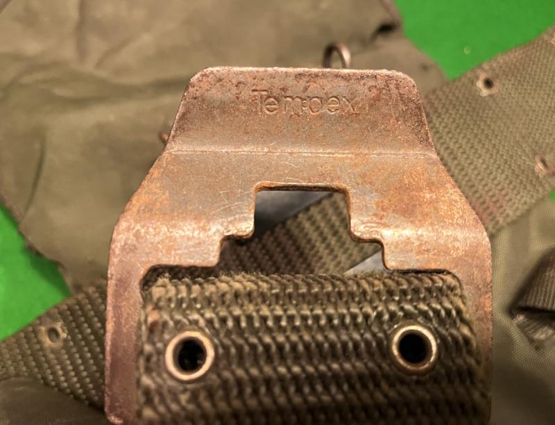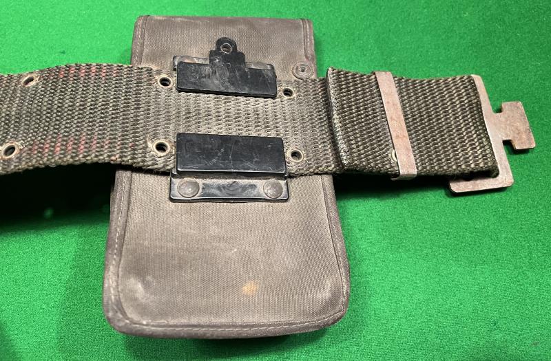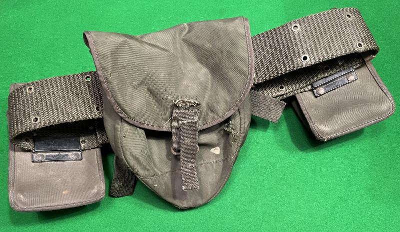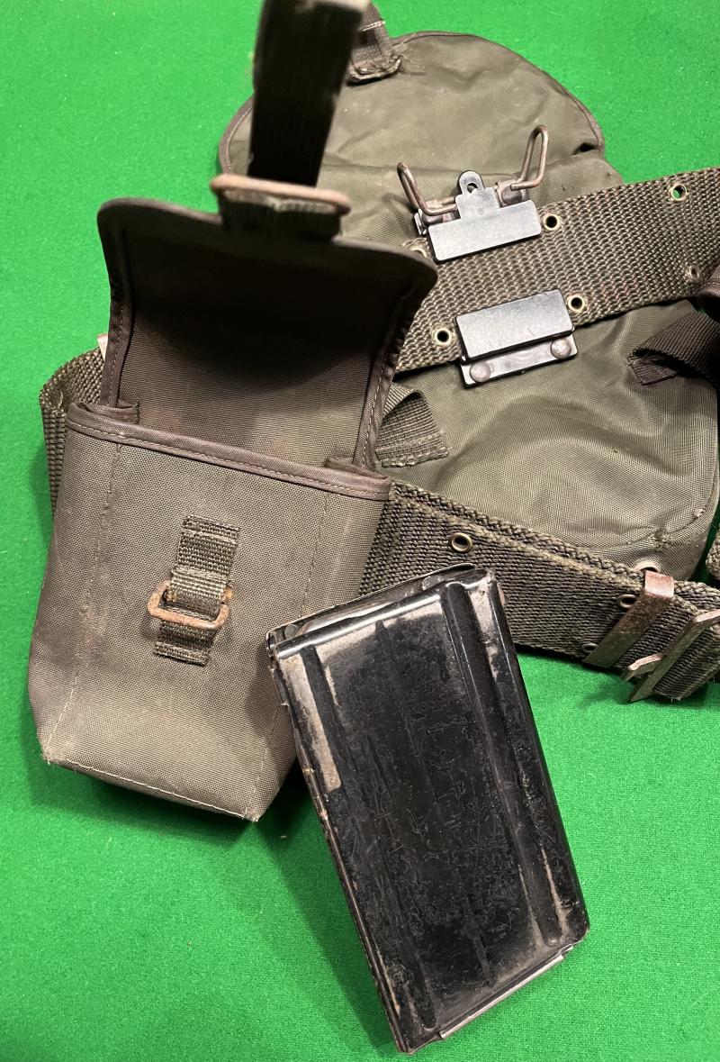 A set of Argentinian, nylon Tempex webbing consisting of belt, 2 x magazine pouches and entrenching tool cover complete with one FN magazine. Typical of souvenirs bought back from the Falkands, grubby from use and lightly rusted metal fittings with buckle clearly marked ' Tempex '.