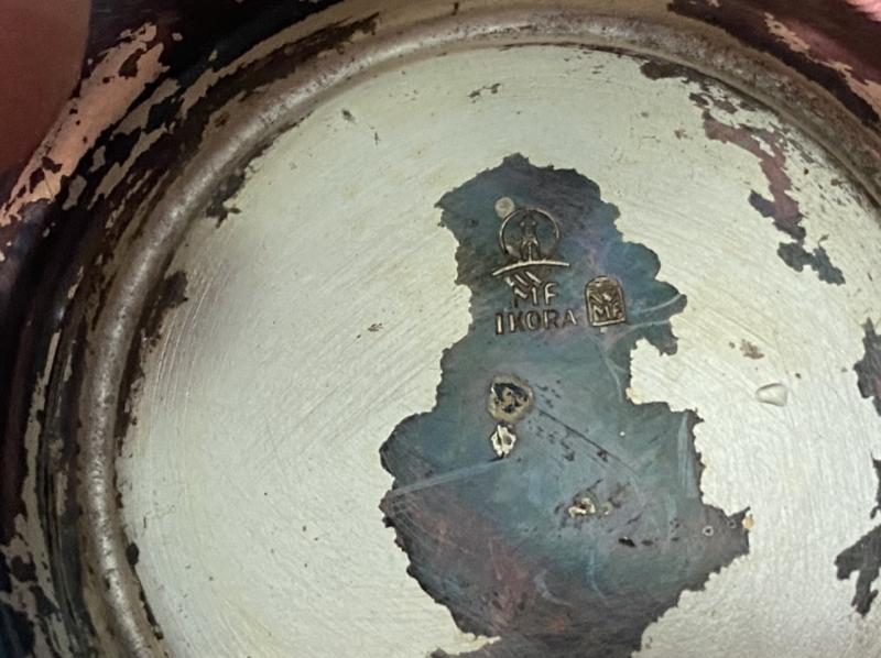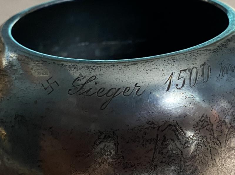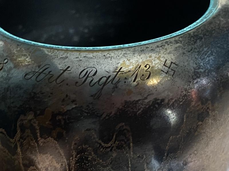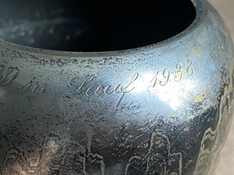 This is a wonderful silver plated ‘art deco’ style vase/award made by the famous WMF company (who still exist today). It stands about 8” tall and has a pleasing wavy design around the middle. The rim is jeweller engraved with the award details in German. It reads ‘Winner 1500 metres race 1938 Artillary Regt 13’ the inscription is bordered by a small swastika at each end. Beautifully done and I imagine this was displayed in the Regimental trophy case. It does not say what the race was exactly. Running perhaps? The vase/cup has a high silver content and has therefore toned to a much darker colour over time. If you wished to clean it carefully, it would be up to the purchaser. Nice display item.