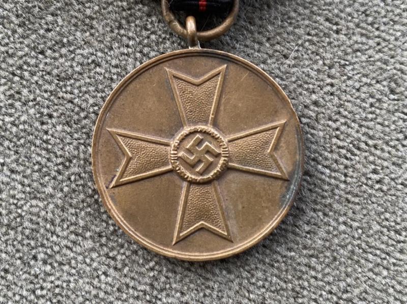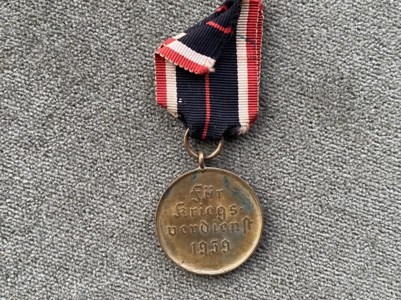 Nice German War Merit Medal in bronze . The award has the age staining that often occurs with these, but it is not too bad. Given to Foreign Labour that helped Germany in the War Effort. Original piece of ribbon attached