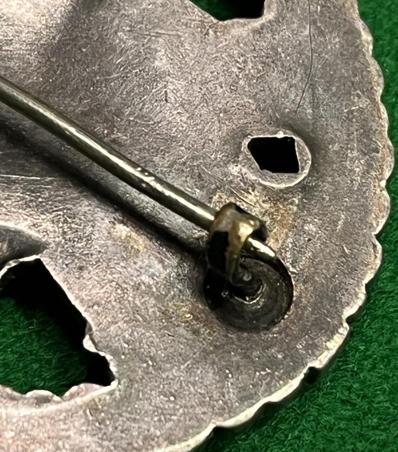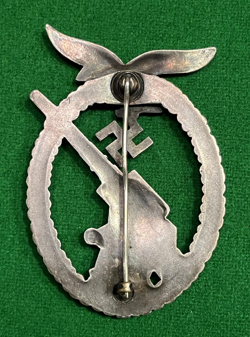 Excellent, early Luftwaffe Flak badge. Neusilber construction with ball hinge fitting and semi-scooped reverse. Thought to be the product of one of the Gablonz manufacturers, possibly Adolf Scholze, and of early design and issue and as is typical of these badges no manufacturer markings to reverse. Highly detailed, crisp detail with light polishing to high points with crimped in tombac fittings with a slightly distorted thin pin. Classic example.