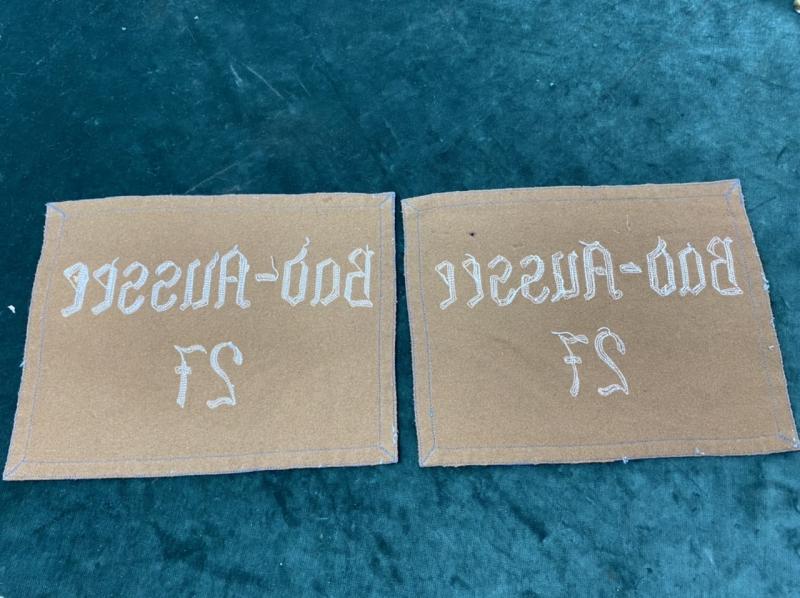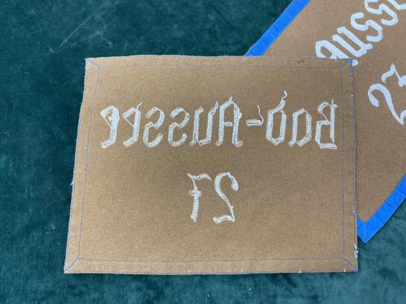 Here are a pair of mint ‘patches’ from one of those banners. As far as I can see they have perhaps never been seen to a flag, and apart from a small moth ‘nip’ on the reverse of one, remain in mint condition. Tan brown felt material, bordered in blue tape. The area