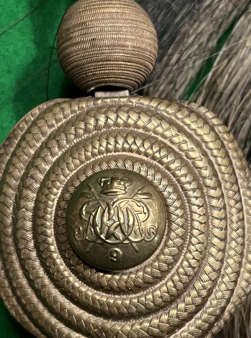 O/R's Lance cap plume and holder for a member of the 9th Lancers. Brass gimp boss with a 9th Lancers button to centre surmounted by a brass plume holder with a black over white horsehair plume unique to the 9th Lancers. Good, used condition.