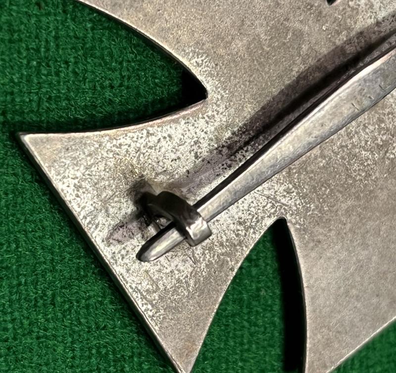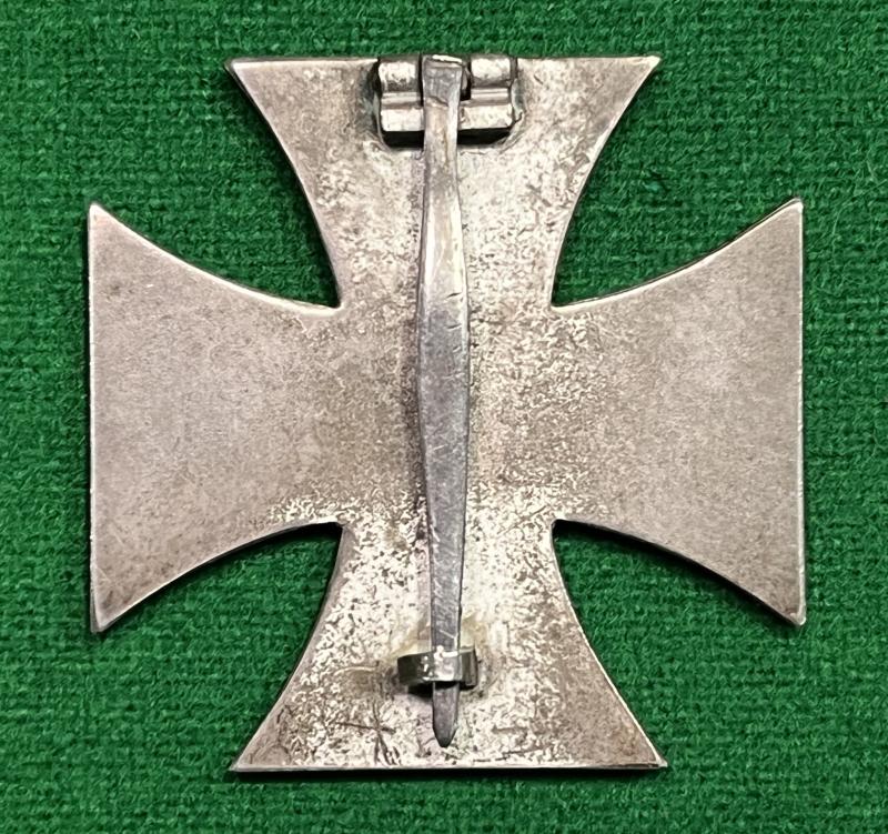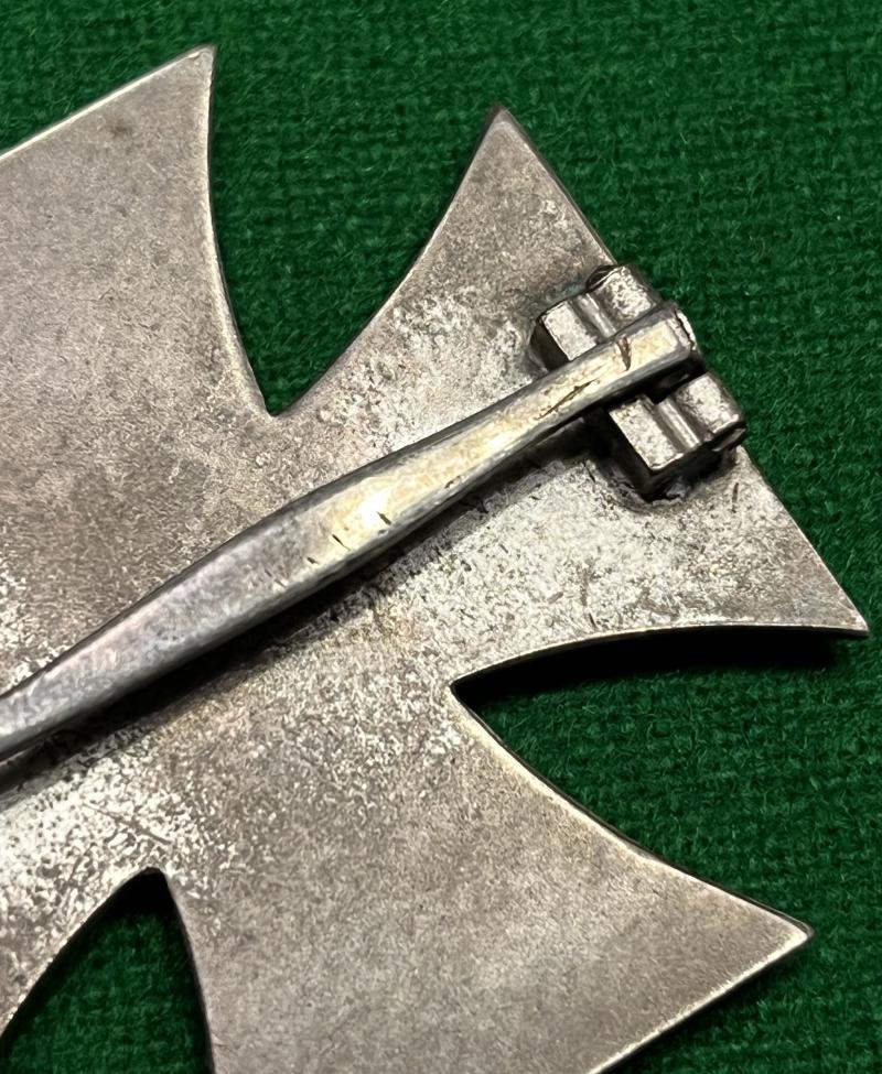 A good honest, heavily worn EKI that has come from a private source. Heavily toned frame with wear to the highpoints of the core, block hinge with contoured pin and flat wire catch. Reverse of the pin is incused with the mark ' 100 ' indicating manufacture by Rudolf Wachtler & Lange, Mittweida. Grubby condition.