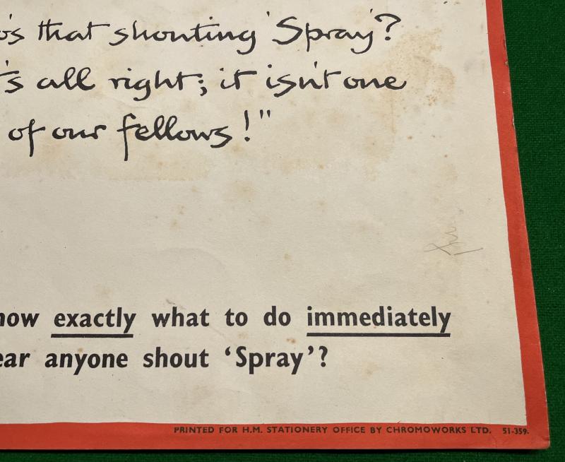 Part of a series of posters created by ' Fougasse ' the artist Kenneth Bird ( famous for his ' Careless Talk ' poster series), for the Army highlighting defensive measure against Gas. 36cms x 24cms approx. printed by Chromoworks Ltd., a favoured Government contractor for posters. Good, used condition with light marking and some minor marks and creases. Uncommon.