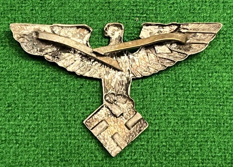 Early M29 eagle for use on SA/SS and Party headwear. Die struck white metal with silver wash finish with both fixing pins intact. Good, used condition with wear to the high points.