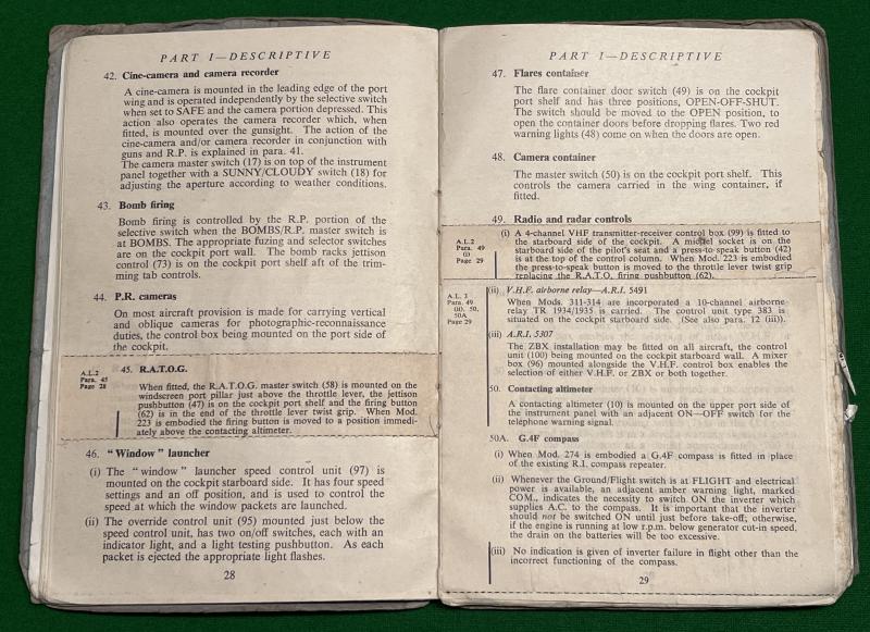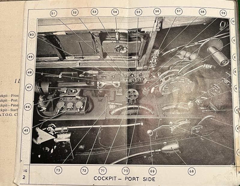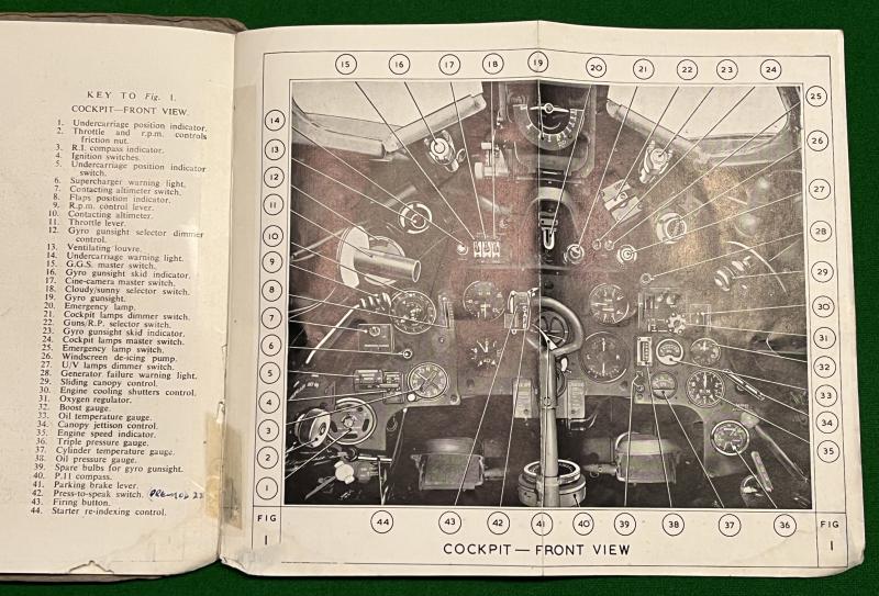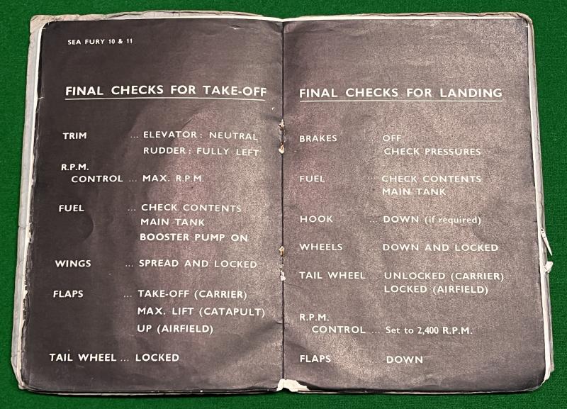 1950 2nd ed. Pilot's Notes for Sea Fury 10 & 11. 56pgs + fold-out plates showing cockpit layouts, instrumentation etc. Heavily used with staining, marking and minor tears but an original edition.