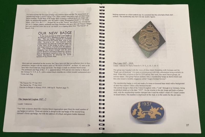 ' British Fascist Regalia 1920's to 1940 ' - Jamie Cross. 55pg, illustrated guide to regalia from many of the pre-War fascist organisations including the British Fascists, BUF and the Imperial Facist League. Also includes details of some of the smaller groups such as the FUBW, The Link etc. Good, used condition with some marking to rear cover.