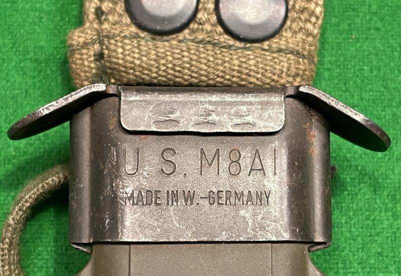 US M7 knife bayonet for the M16 rifle. Manufactured in W.Germany under contract to Colt's with clear markings to parkerised 165mm double edged blade. Crossguard marked ' M7 ' and contained in a M8A1 scabbard with lace lanyard. Excellent, clean condition.