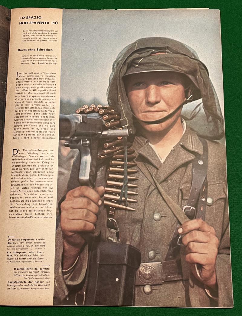 Dual language, Italian/German 1943 edition of Signal featuring a Tiger to the front cover. Usual contents of war news and with colour centre presentation. Good, used condition with some chipping to spine.