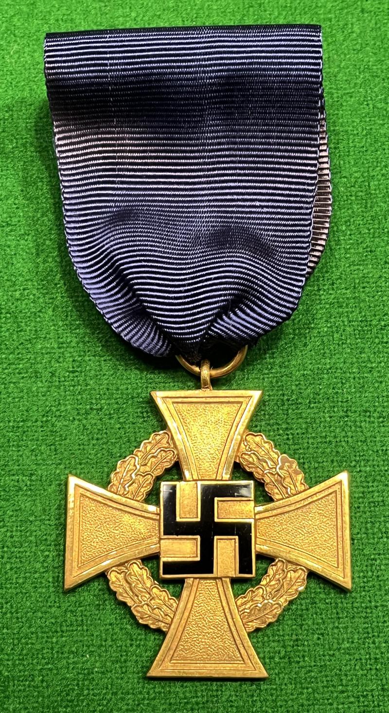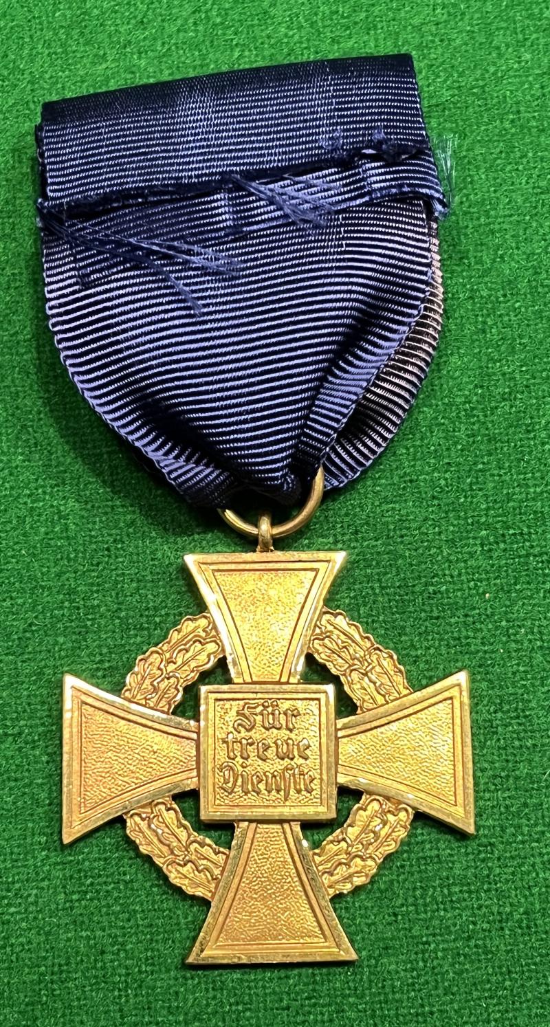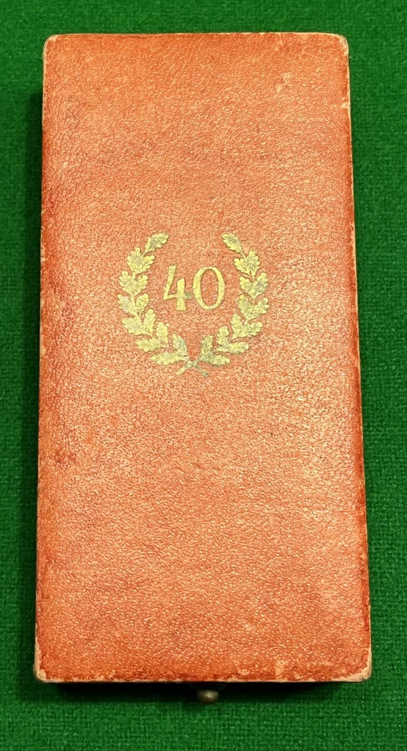 Gilt and enamel 40 Years Faithful Service Medal contained in the box of issue. Medal in good bright condition with some fading to ribbon. Case has marking , staining and rubbing with, presumably, the original owner's name inscribed to the lining.