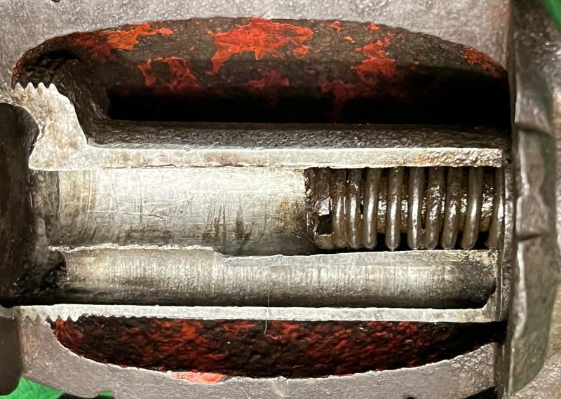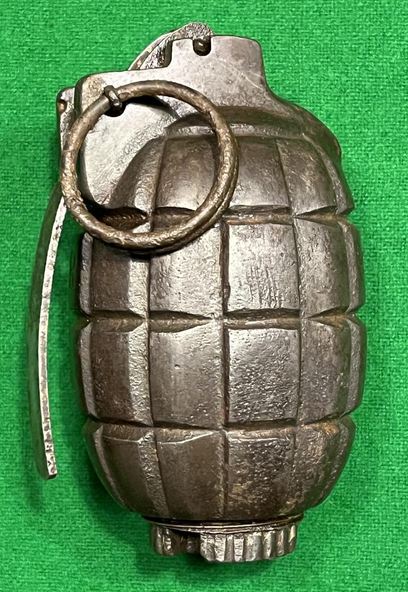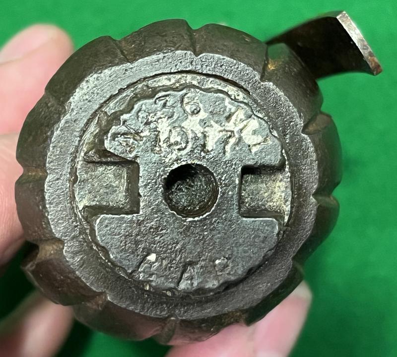 Officially sectioned 1917 dated No.36 MkI. Body marked ' R ' beneath lever indicating probable manufacture by Revo of Tipton with a base plug marked ' E.A.R. ' ? Very much ' out of the woodwork ' find with some corrosion to both lever and ring and the base plug firmly ensconced. Some areas of surface corrosion with 60% of interior red finish. All parts present . This example would benefit a little tlc.