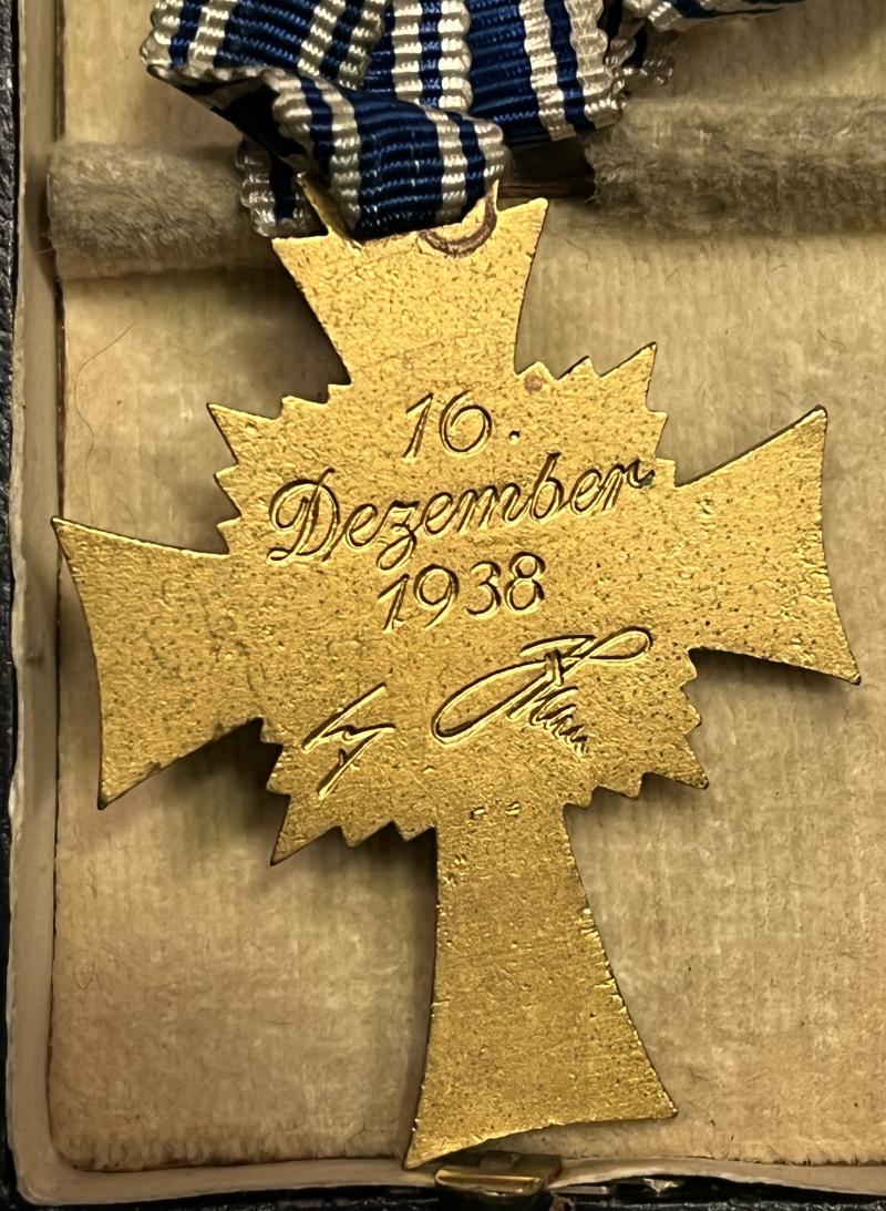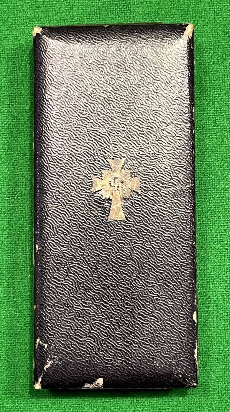 A good example of a Mothers Cross in gold, cased with its full length ribbon, in its original fitted box. Gold blocked to the exterior of the box with the outline of the award, with a retailer’s name ' Werner Redo Saarlauten 'blocked to the silk upper inner lid. Cross in excellent, bright condition with the case having a few small marks and scuffs.