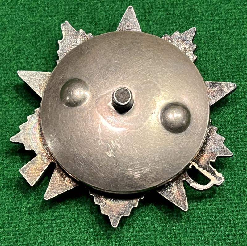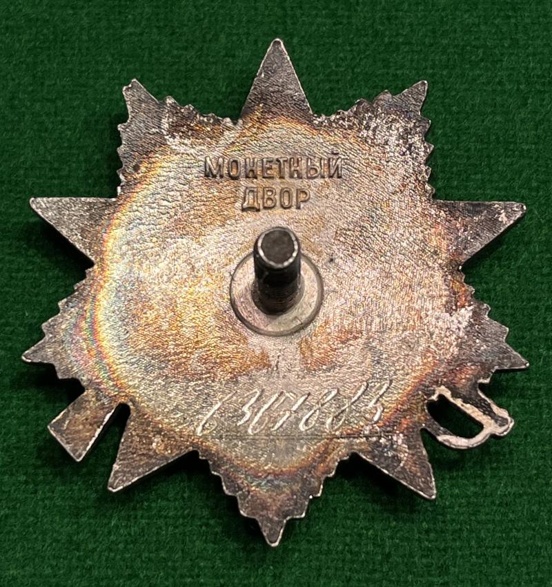 A Soviet Order of the Patriotic War 1st Class. Good, used example with undamaged enamel and heavily patinated overall. Manufacturer marked to reverse with inscribed issue number. Unresearched.