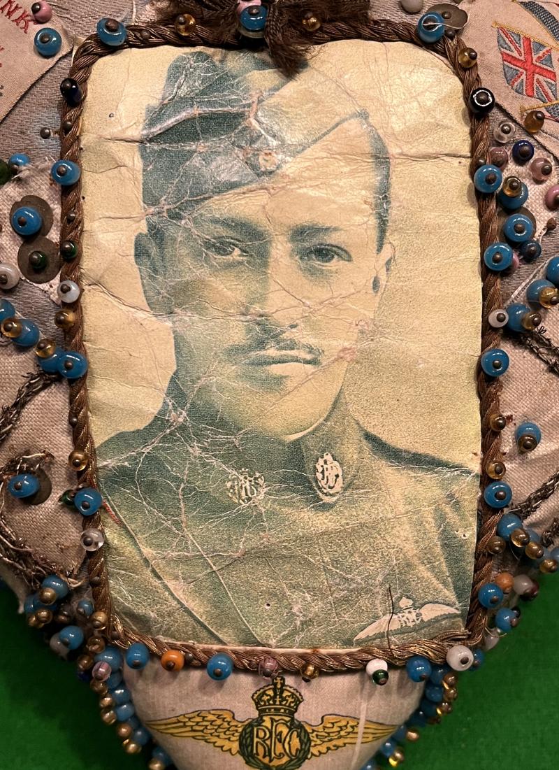 An example of the popular WW1 handicraft of pinwork. Featuring a heart shaped cushion with colourful pins and bullion surrounding RFC images. Good, used condition.