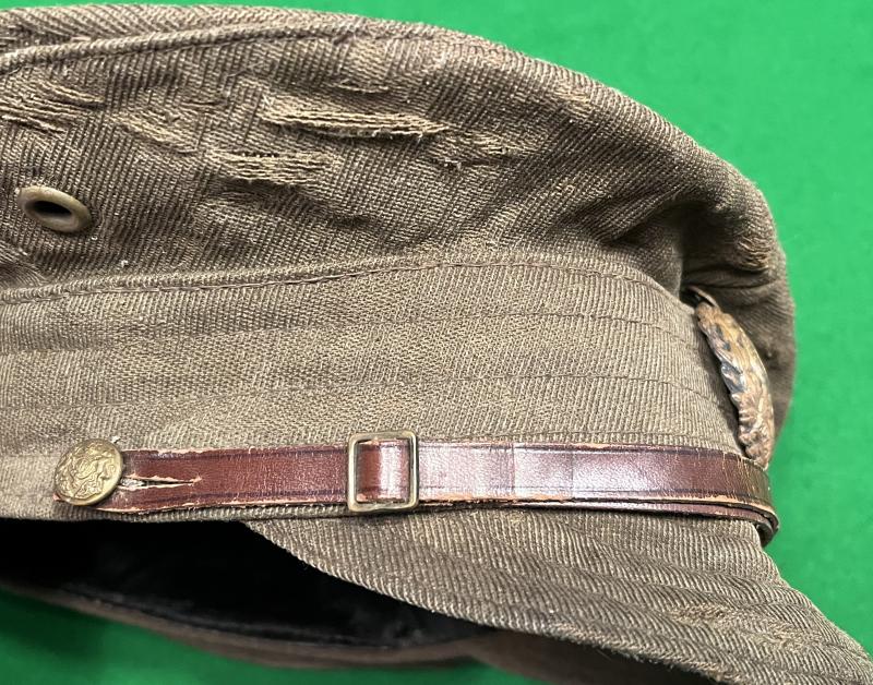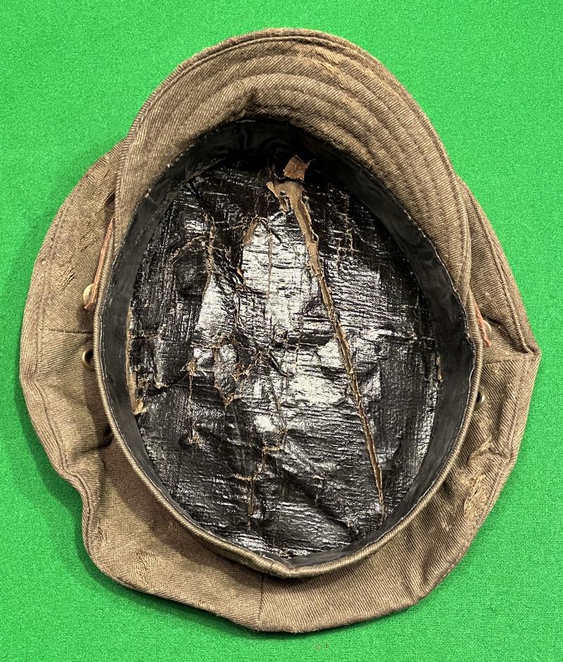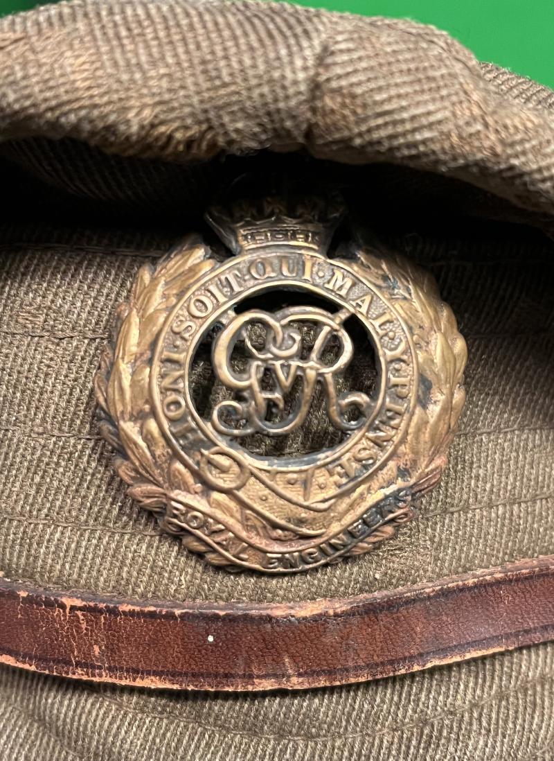 Highly characterful WW1 pattern Royal Engineers, other rank's denim trench cap. Featuring a ' domed ' RE cap badge that has been worked to give a more pleasing appearance with correct pattern narrow brown leather chinstrap. The interior with full oilcloth lining and residual WD issue stamp. The cap retains an as worn shape with various snags to body and a cracked and torn lining. Evocative piece.